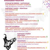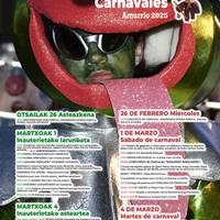 12:30 // Erraldoien eta buruhandien kalejira gaiteroekin eta kakarroekin, Juan Urrutia plazatik abiatuta. Kalejira bitartean Aiara dantza taldearen ekitaldia13:30 // Kalejira Batukada Batuere taldearekin17.00 // MUSIKA ANIMAZIOA Juan Urrutia plazan19:00 // "KAKARRO BIRIGARRO" MOZORRO LEHIAKETADesfilearen zirkuitua: Santa Maria eliza, Elexondo, Aiara, Iturralde, Juan Urrutia plazaDesfilearen ondoren, mozorroen aurkezpena Plazan. SARIAK: A kategoria: 1etik 3ra: Lehen saria: 100 euro eta kakarro figura bat. Bigarren saria: 50 euro B kategoria: 4-10 pertsonako taldeak: Lehen saria: 325 euro eta kakarro figura bat. Bigarren saria: 200 euro.Hirugarren saria: 110 euro. C kategoria: 10 pertsonatik gorako taldeak: Lehen saria: 575 euro eta kakarro figura bat. Bigarren saria: 275 euro.Hirugarren saria: 150 euro. D kategoria: Heldu-taldeak haurrekin. Nahitaezko gaia: EUSKAL INAUTERIAK. Lehen saria: 325 euro eta kakarro figura bat.Bigarren saria: 200 euro. Koreografia onenaren saria desfilean: 120 euro IZAN AMURRIOren txarteletan. Mozorro Lehiaketan parte hartzen duten pertsona guztien artean saski bat zozketatuko da 0 kilometroko produktuekin. Txokolate-jana Juan Urrutia plazan, desfilea amaitzean.20:30 // MOZORRO LEHIAKETAREN sari banaketa.20:00-22: 30 // JAIKIDE DJa Juan Urrutia plazan. 22:45-00:45 // Kalejira eta animazioa Elektrotxaranga Rockalean taldearen eskutik01:00-04: 00 // DJ Blessive Juan Urrutia plazan
