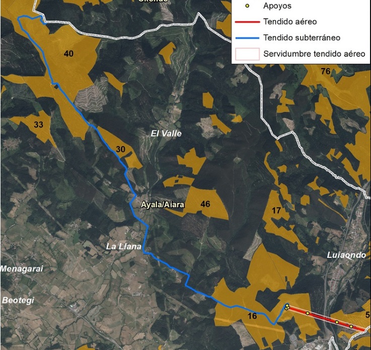 Hori argudiatzeko aipatu dute proiektuak menpeko lursail ugari hartuko dituela; 76 metro arteko zabalerakoa aireko linearen kasuan, eta 7 metroko zortasun iraunkorrak lurpeko tartearen kasuan.