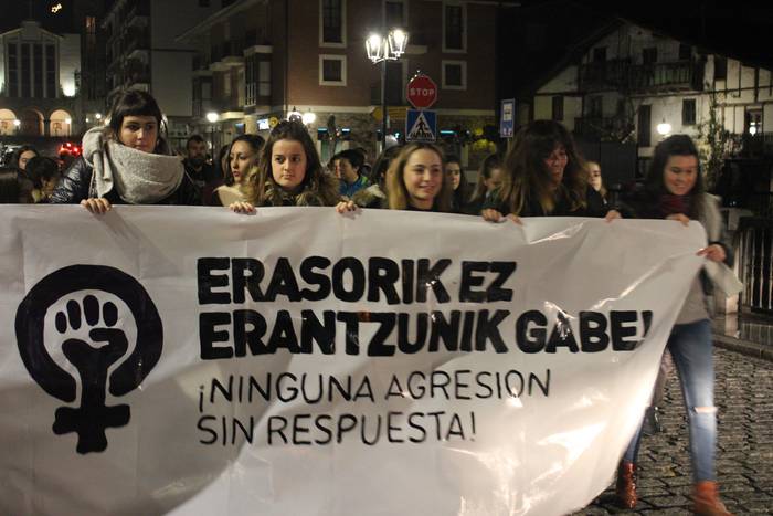 Gehienetan jarrera horiek ikusezin egiten zaizkigu, normaltzat hartu eta mespretxatzen dira. Erasotzaileak, bere burua salatua ikustean; ustezko errugabetasuna eta zintzotasuna aldarrikatu eta babesten tematu ohi da. Maskulinitate matxistaren erantzun tipikoa. Aurrez aurre izan ditugu aurtengo jaietan ere, ez behin, ez birritan. Sare sozialetan, itxuraz umoretsua den eta praktikan eraso matxistak justifikatu eta borroka feminista gutxiesten duen komentarioan, eta zuzenean, haren pribilegioen bidez emakumeak objektutzat hartuz “ligatzen” saiatzen den gizonean. Nire pribilegioetan. Ez alkohola, ez drogak, ez gona laburrak, ezta ustezko gonbiteak ere; ez dago aitzakiarik eraso matxista baten aurrean, ez jaietan ezta gainontzeko urteko egunetan ere.