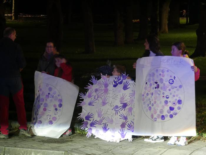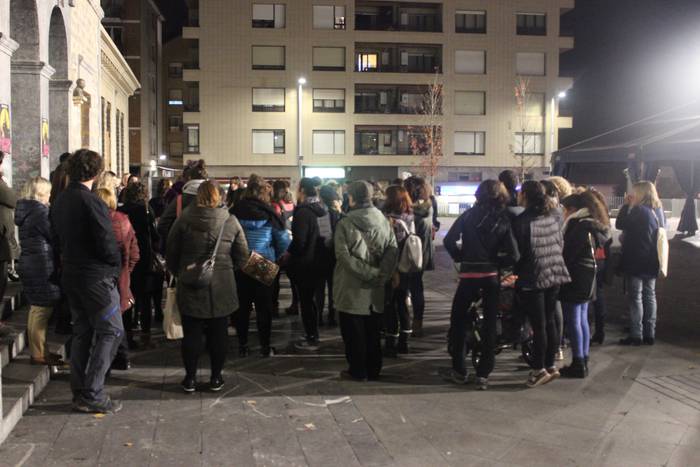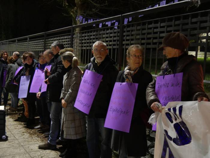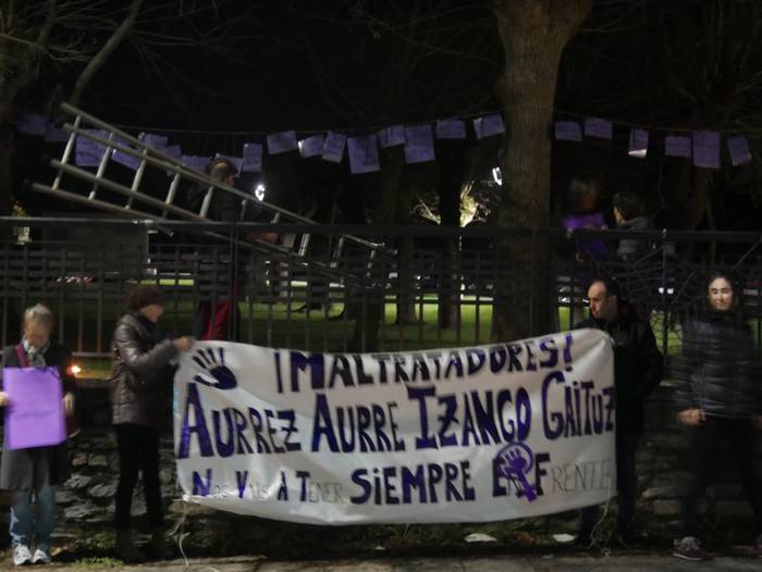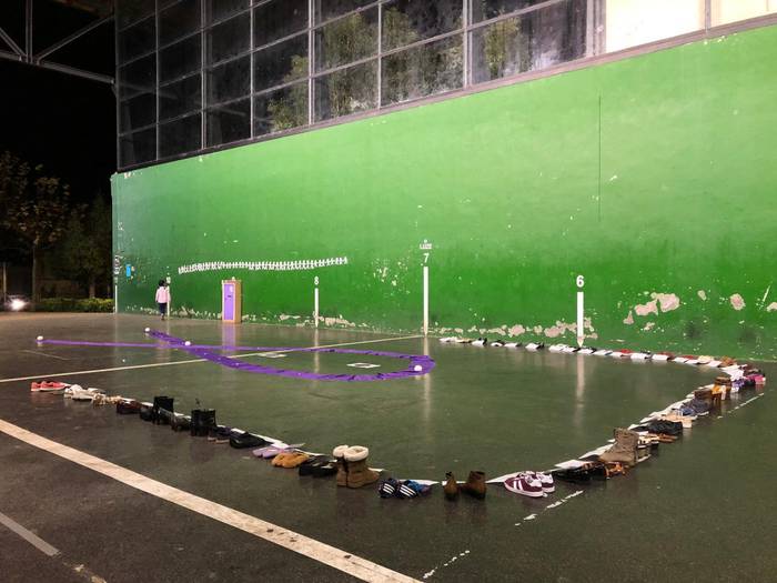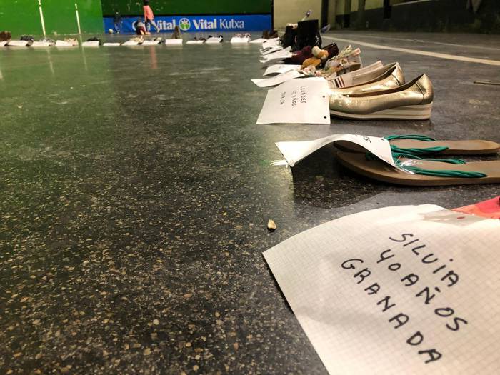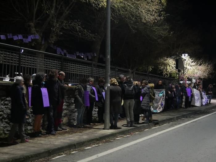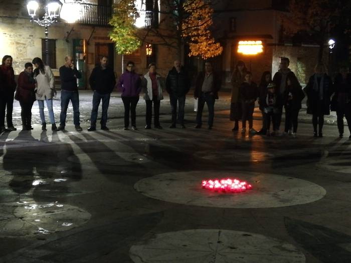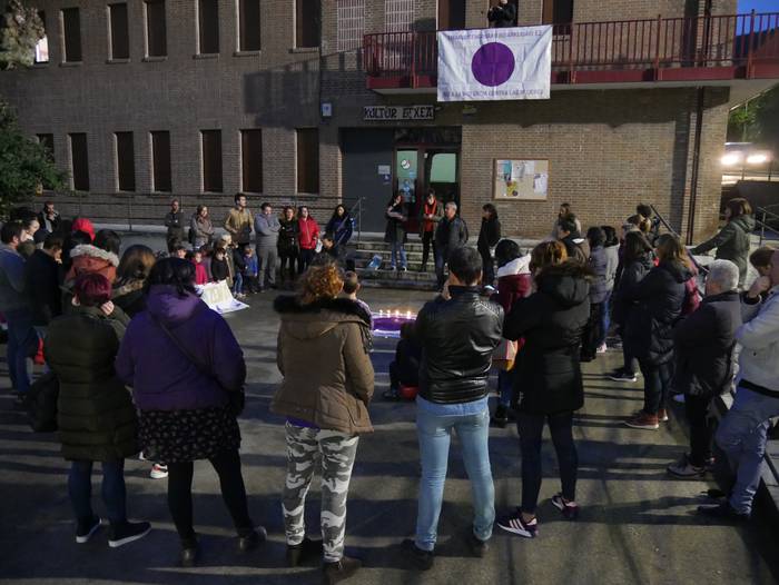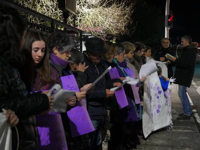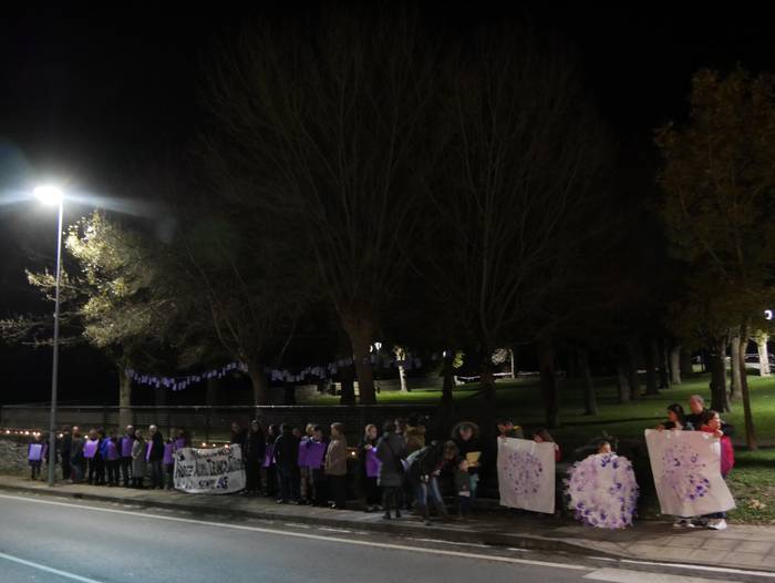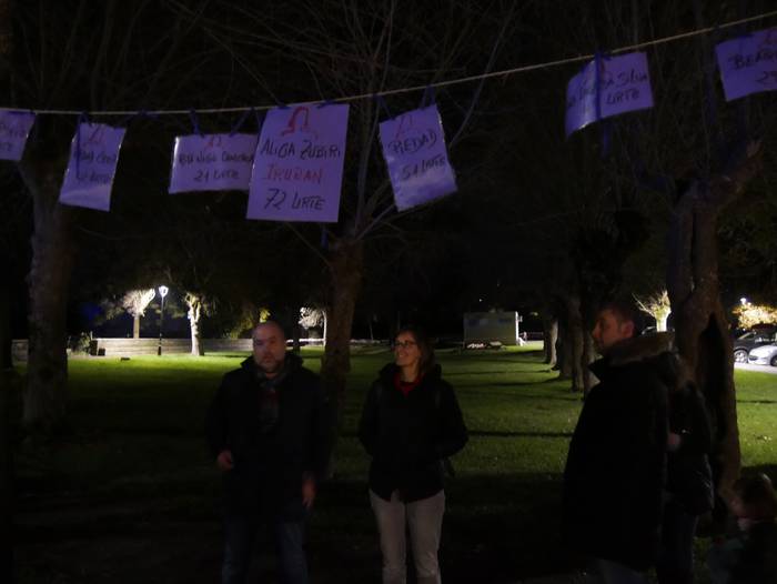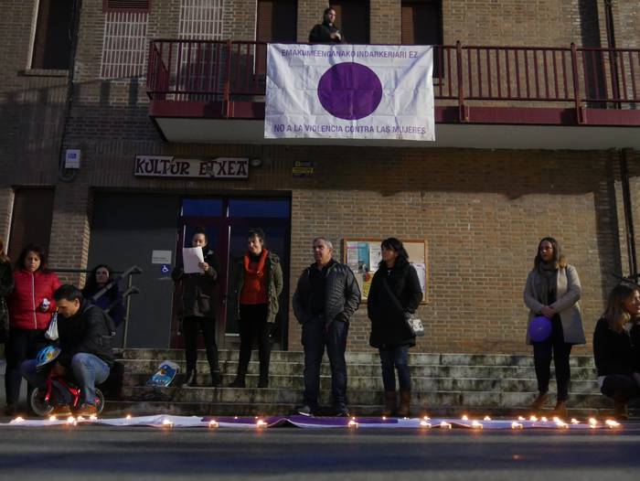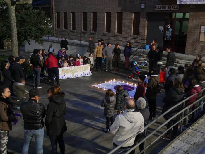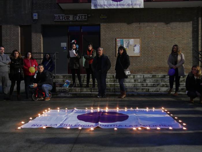 Artziniegan dozenaka lagun bertaratu dira frontoian egin den ekimenera. Oinetako parez bete dute zorua, indarkeria matxistak aurten eraildako emakumeen omenez. Aiaran eta Okondon, aldiz, kandelak baliatu dituzte aldarriak pizteko.