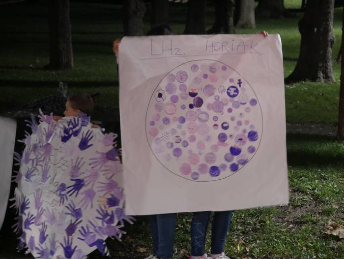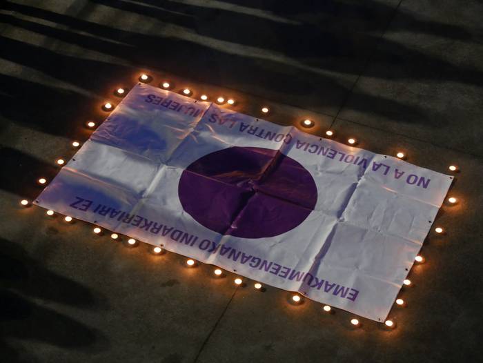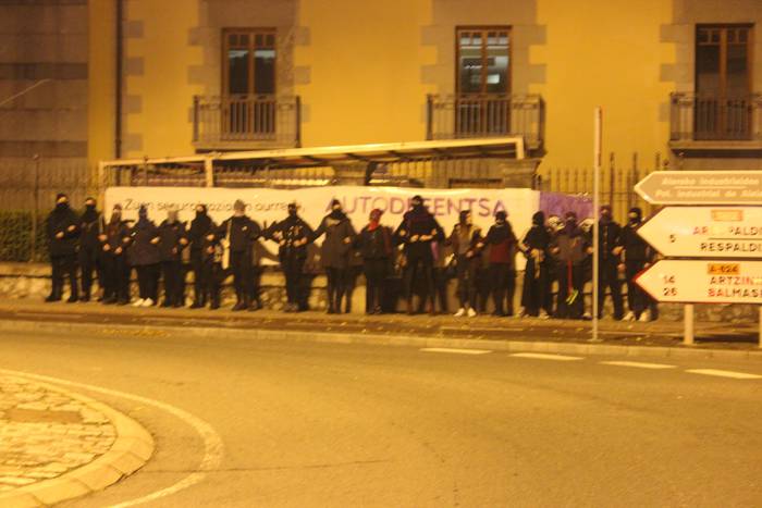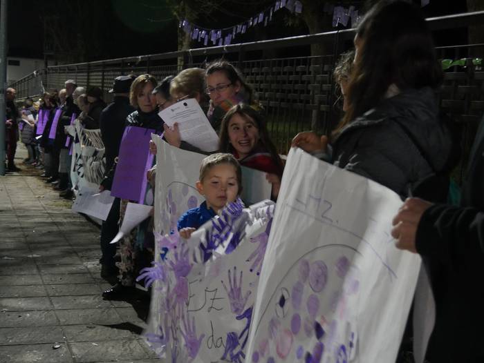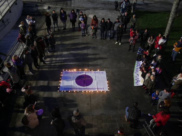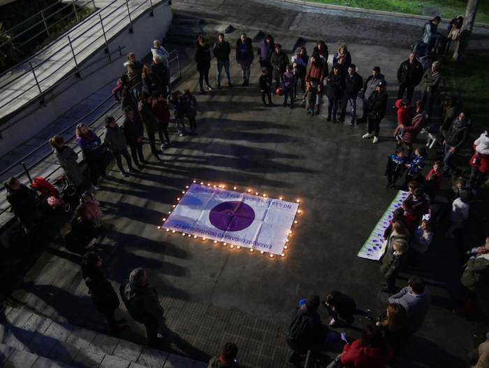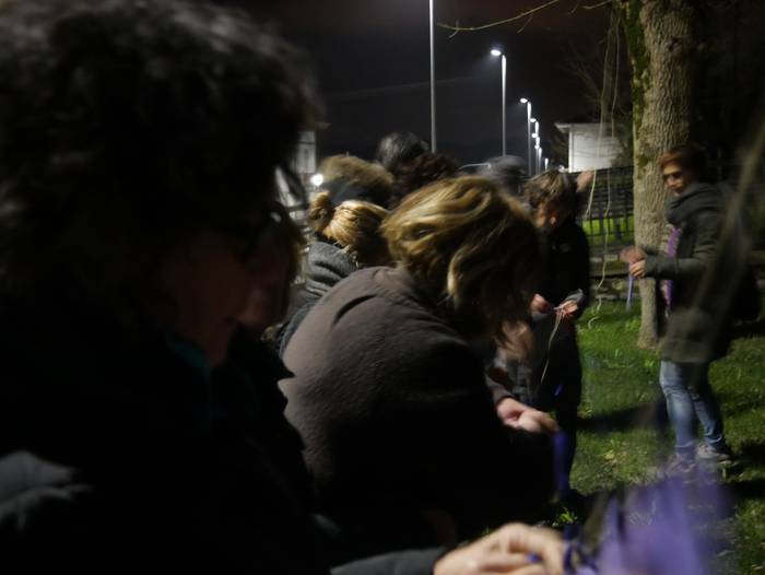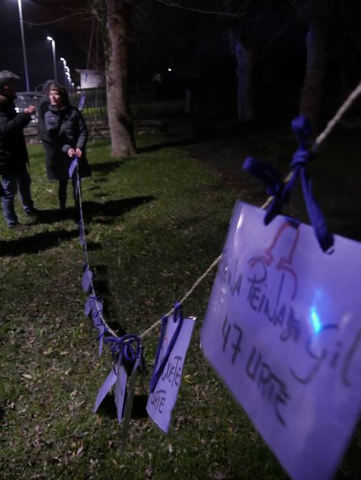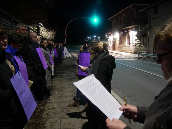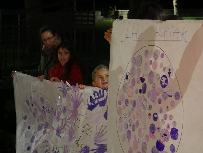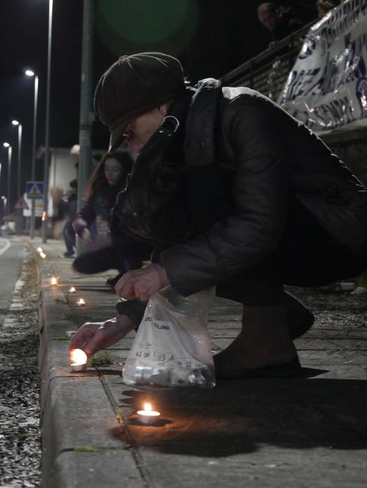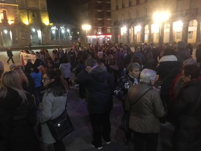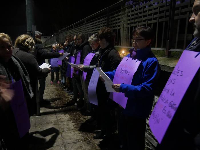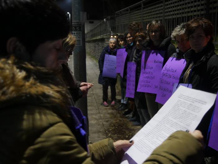 Artziniegan dozenaka lagun bertaratu dira frontoian egin den ekimenera. Oinetako parez bete dute zorua, indarkeria matxistak aurten eraildako emakumeen omenez. Aiaran eta Okondon, aldiz, kandelak baliatu dituzte aldarriak pizteko.
