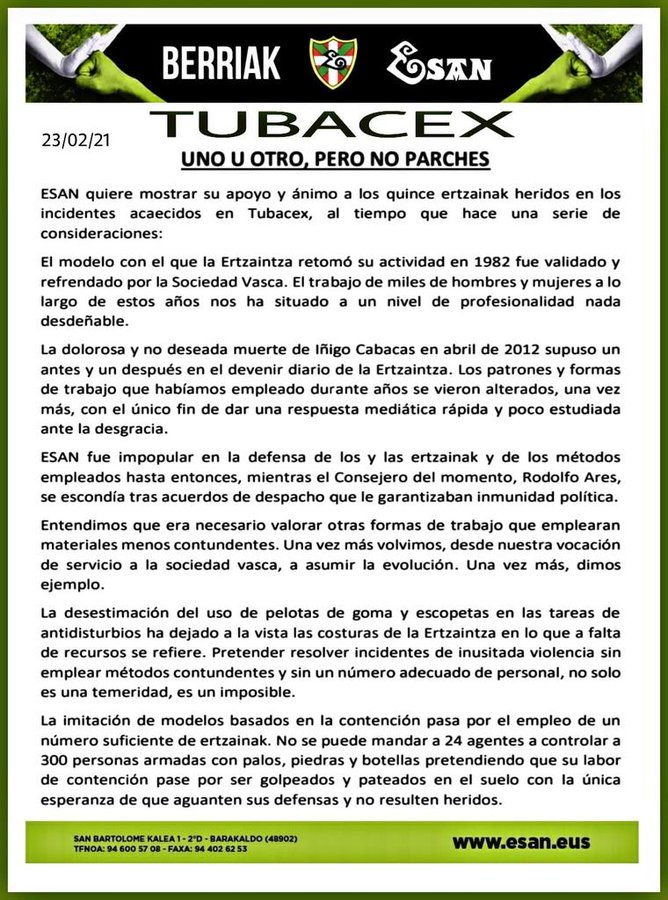 Pentsa dezagun Bingen Zubiriaren hitzetan Athleticzaleen kontrako oldarraldiei buruz mintzatzean. Eusko Jaurlaritzako bozeramaileak adierazi zuen Euskadi ez dela estatu poliziala, baina Tubacexeko piketeetan egunero bizitzen denak kontrakoa iradokitzen du.