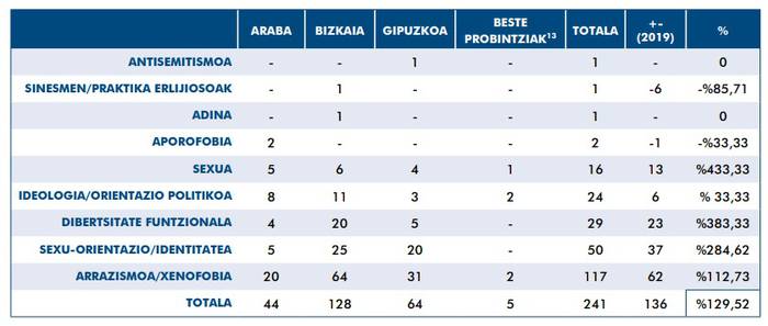 Goiko taulan ikusi daitekeenez, EAEn jazotako gorroto delituen ia erdia arrazismo edota xenofobiari lotuak egon ziren (117). Sexu orientazio edota identitateari lotutako kasu ugari ere erregistratu ziren (50), eta baita aniztasun funtzionalari lotutako beste 29 ere.