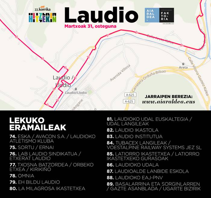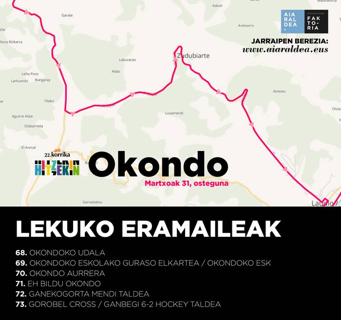 86 kilometro egin ostean Laudiora iritsiko da Korrika, 23:05ean. Okondori hartuko dio lekukoa Garateko gainean. Herriguneko hainbat kaleetan barrena igaroko da ibilbidea, baita Herriko Plazaren erditik ere.