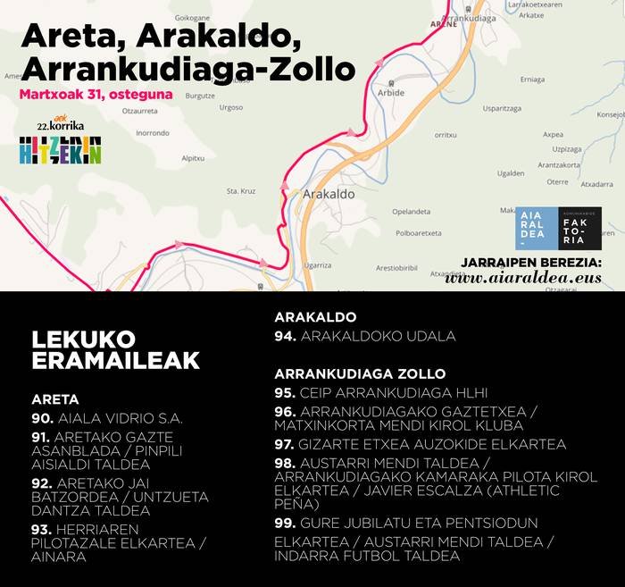 Laudio atzean utzita, Aiaraldeko azken kilometroei ekingo dio Korrikak. Areta izango du lehen geltokia, eta Arakaldora 23:24ean iritsiko da. Azkenik, Arrankudiaga-Zollotik igaro ostean, datorren ediziora arte agurtuko du eskualdea.