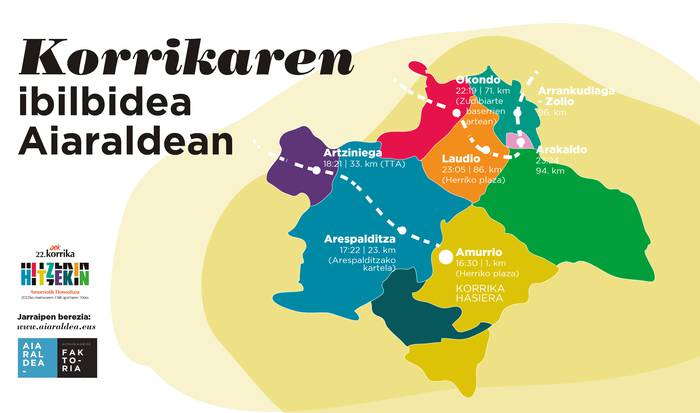 17:22ak aldera Aiaran sartuko da Korrikaren 22. edizioa, Izoriatik hain zuzen. Arespalditza, Ibaguen, Menagarai eta Lanteno ere zeharkatuko ditu bere ibilbidean.