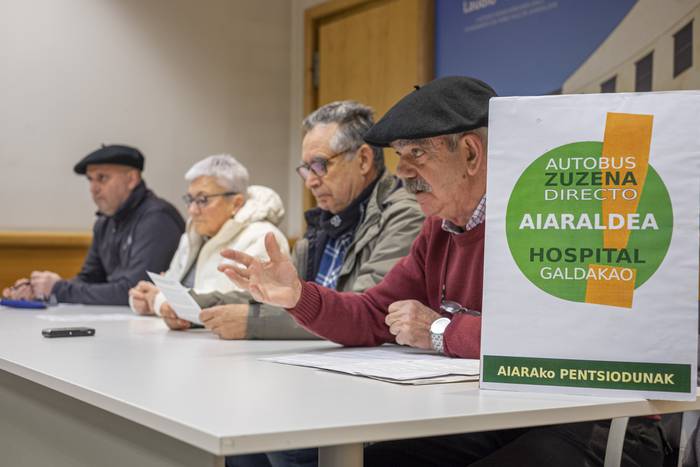 Eskualdetik Usansolo-Galdakaoko ospitalera doan autobus-zerbitzu zuzena aldarrikatu du Aiaraldeko Pentsiodunen Mugimenduak. Agerraldia egin dute gaur goizean Laudioko, Amurrioko eta Okondoko udaletan aurkeztu dituzten mozioen nondik norakoak azaltzeko.
