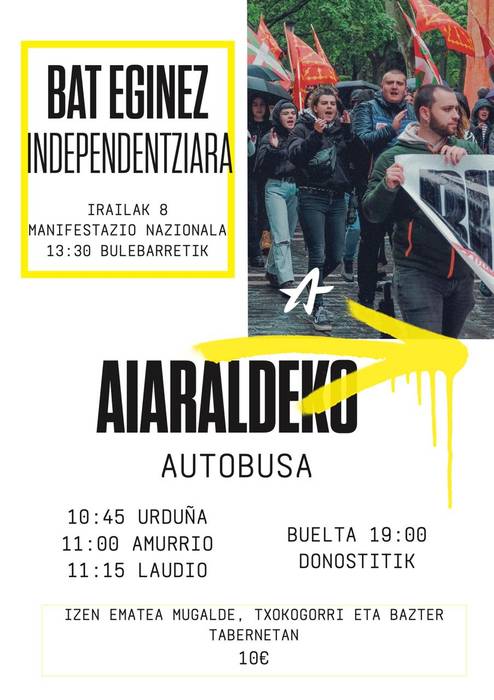 Egoera salatzeko mobilizazio nazionala deitu du Ernaik igande honetarako, hilaren 8rako, Donostian. 10:45ean abiatuko da autobusa Urduñatik, eta geldialdiak egingo ditu Amurrion eta Laudion. Donostiatik buelta 19:00etan izango da. Izena eman daiteke Mugalde, Txokogorri eta Bazter tabernetan, 10 eurotan.