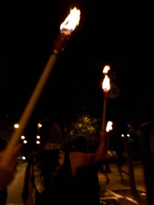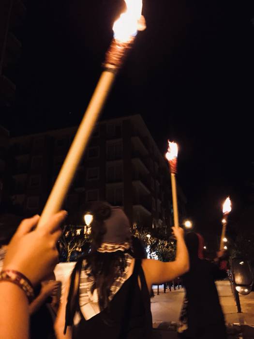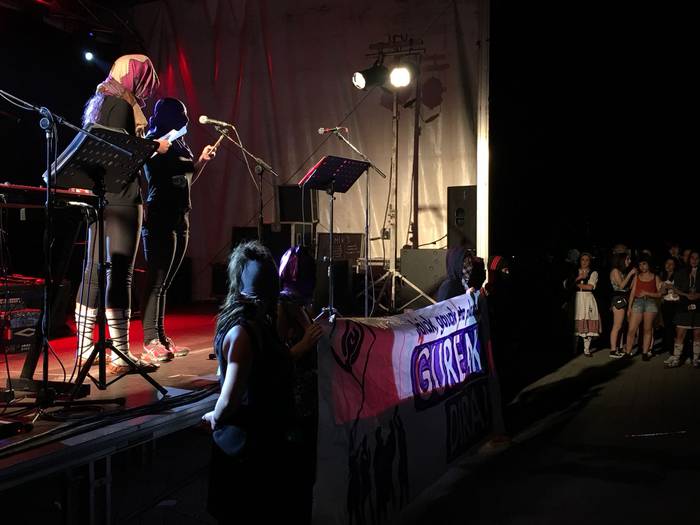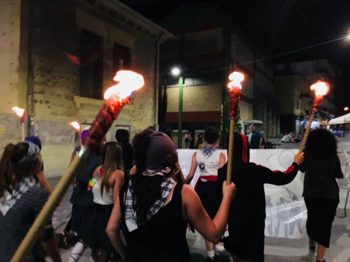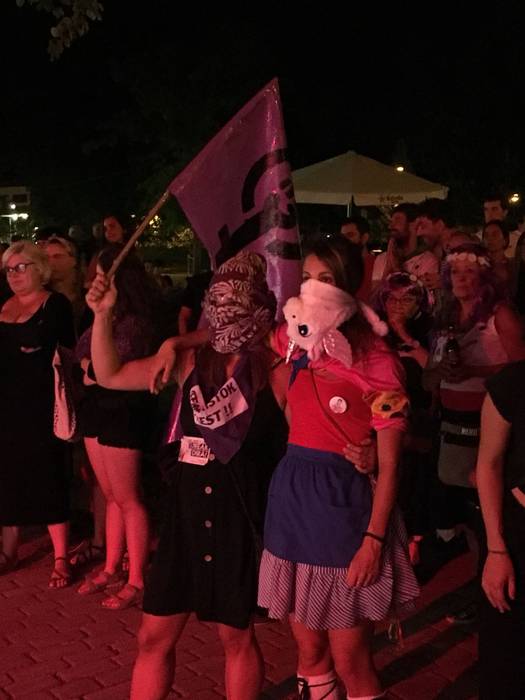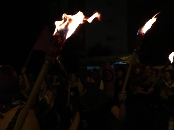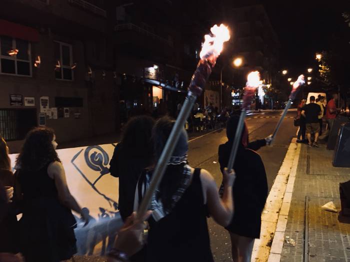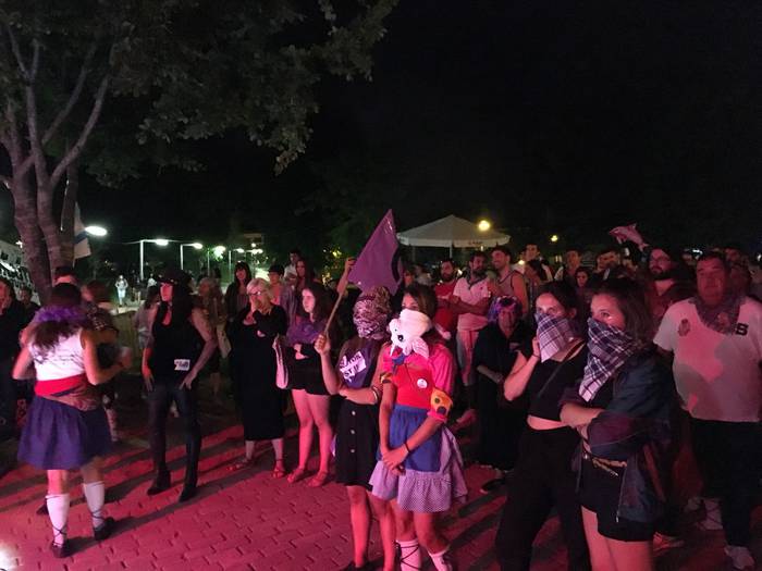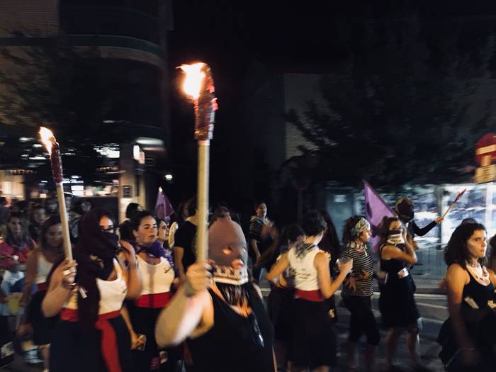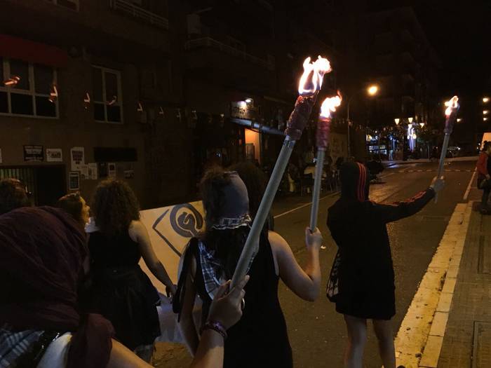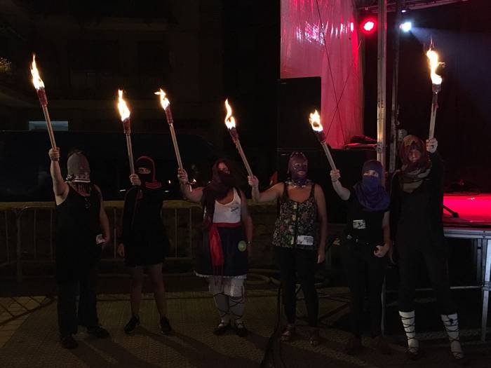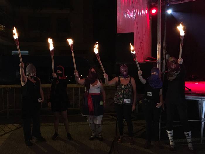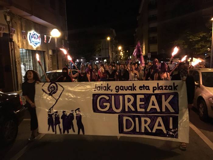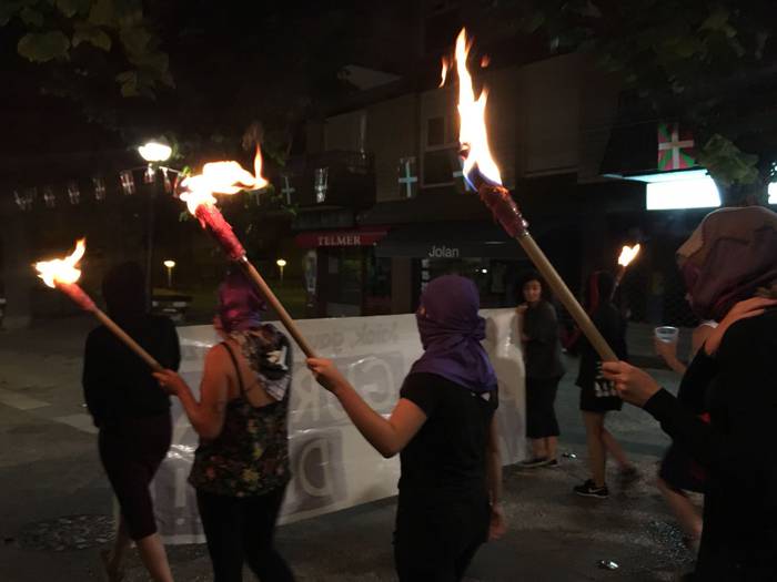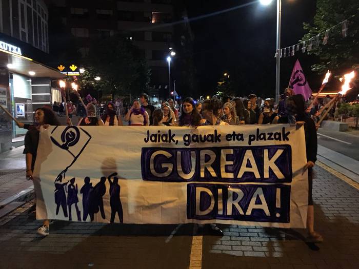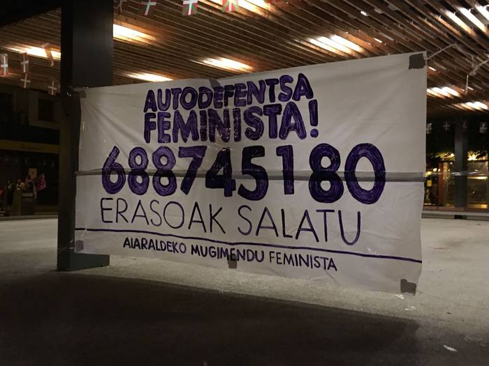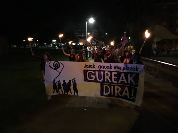 22:30ean zabaldu zuten aldarria, parkean eginiko ekitaldian: "Asko gara, aski gara eta sarertuta gaude. Autodefentsa feminista da gure arma". Emakumeak protagonista izatea zen nahia, horregatik hartu zuten lehen lerroa. "Autodefentsa feminista aldarrikatzea da mobilizazioaren helburua". Hala, beltzez jantzita agertu ziren mugimendu feministako kideak, buruberokiak soinean.