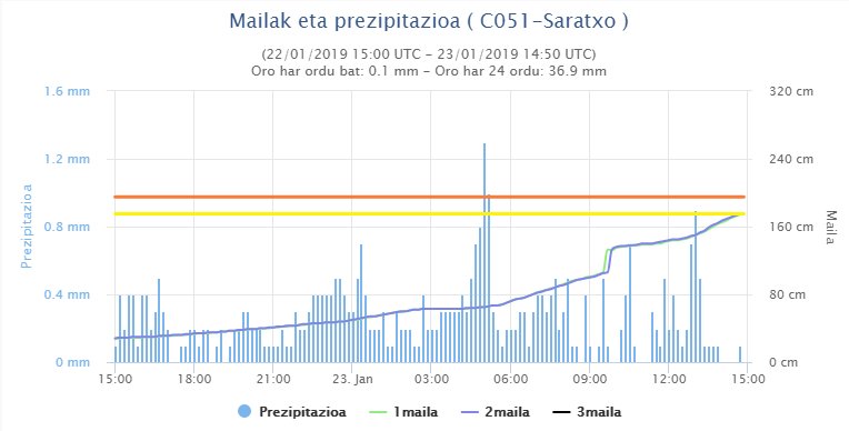 Euskalmetek jakinarazi duenez, "muga laranja" igaro dute Amurrio inguruan. Saratxoko datuak baliatu dituzte horretarako. Grafikoetan ikusten denez, 3:00etatik 06:00etara pilatu da euri gehien, 5:30ak aldera: