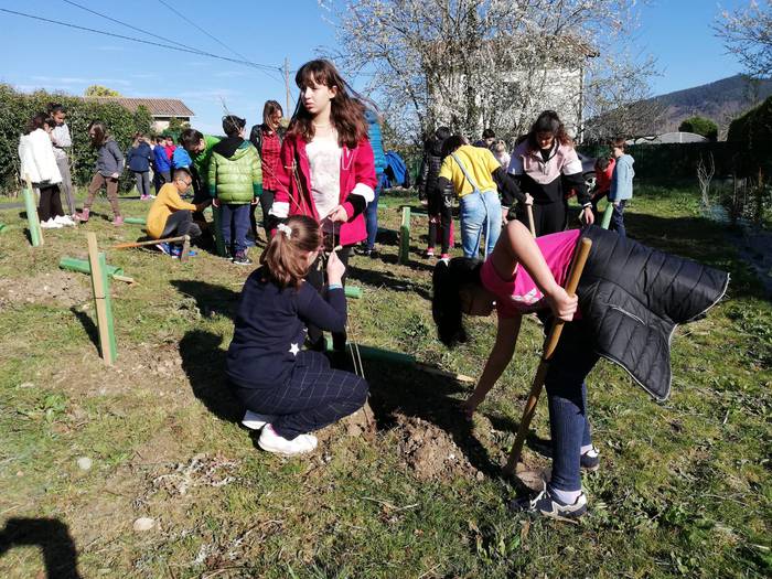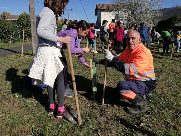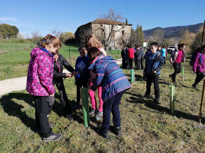 Zuhaitz Eguna egin dute gaur Amurrion. Tokiko zuhaitzak landatzen aritu dira herriko Lehen Hezkuntzako ikasleak. Horrez gain, kutxak jarri dituzte landaketa gunetik gertu, txoriek eta saguzarrek euren habiak egin ditzaten.