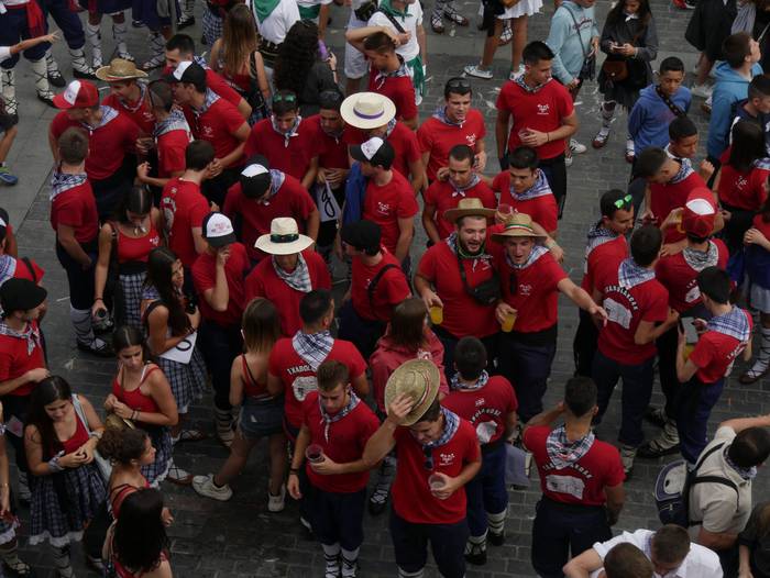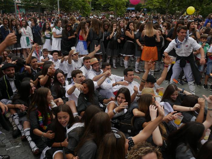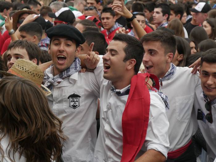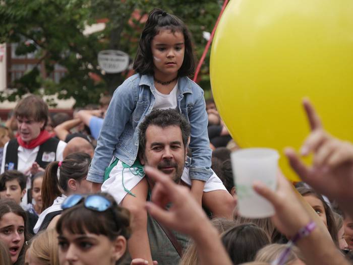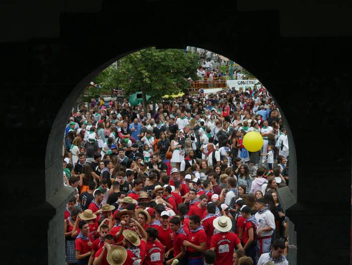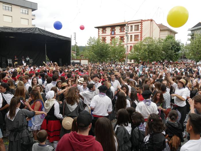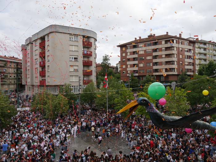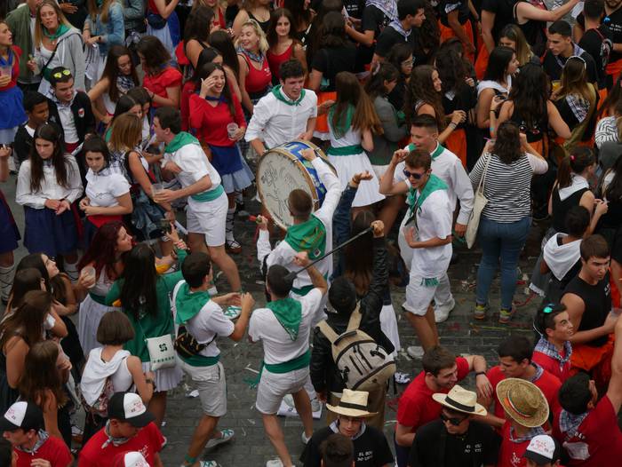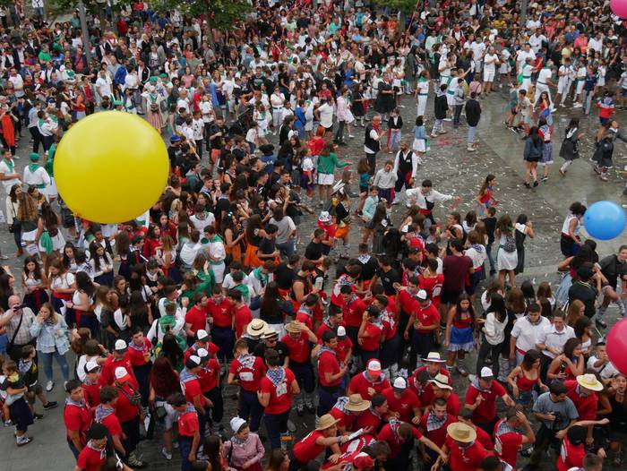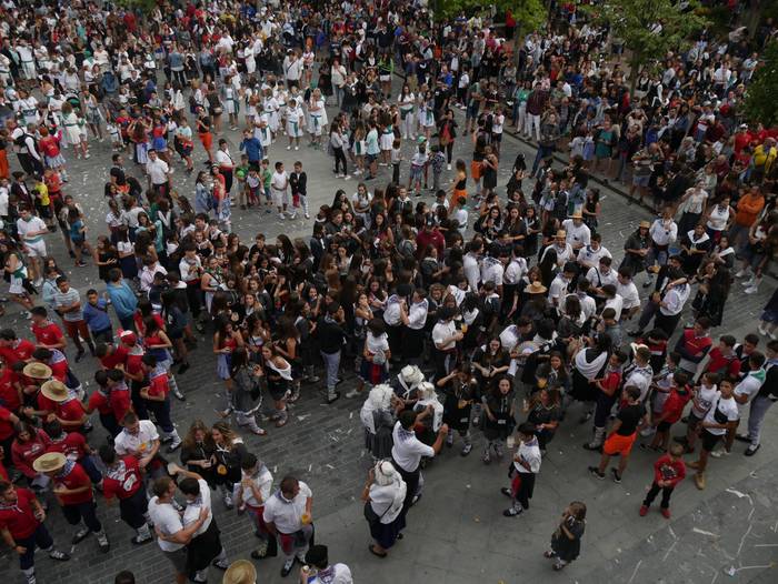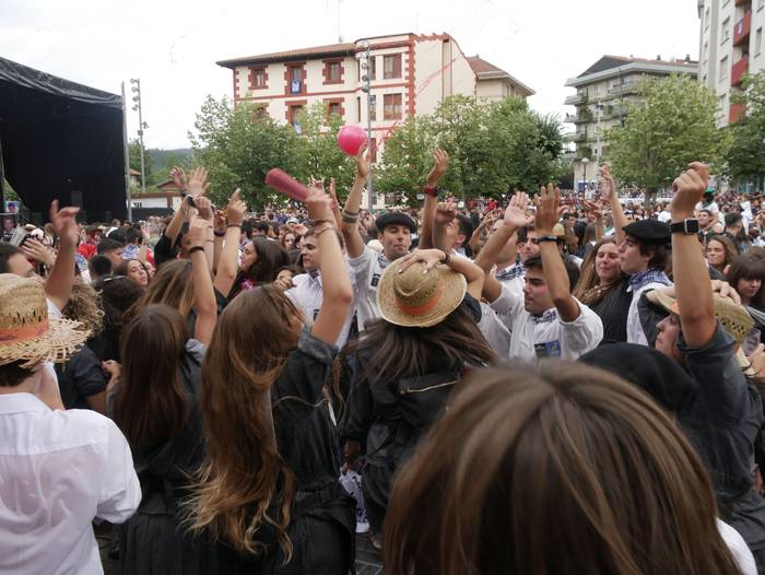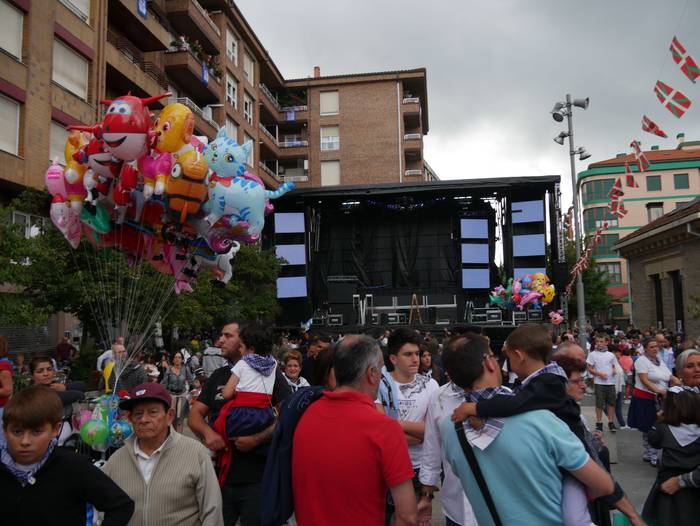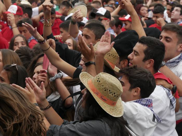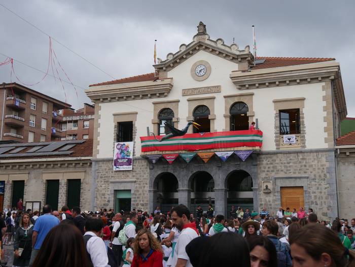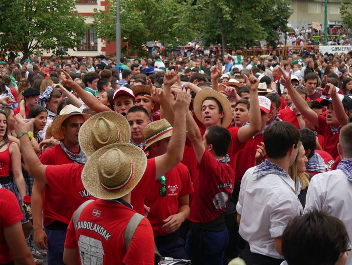 Jende andana batu da nola udaletxe barruan hala kanpoan jaietako txupinazoa ikusteko. Aurtengo pregoia Aiara Dantza Taldeak sortu du, 35. urteurrena bete baitute. Hain zuzen, kide guztiei eskerrak eman dizkie elkarteak. "Hasi dadila festa, hasi dadila sei eguneko dantza!" mezuarekin bukatu du Iraia Aspuru ordezkariak hitzartzea. Ugarte Otxote taldeak kantu batekin omendu ditu dantzariak.