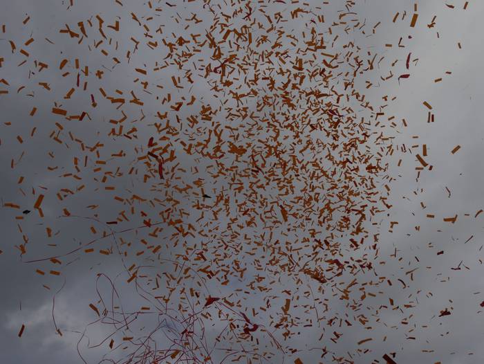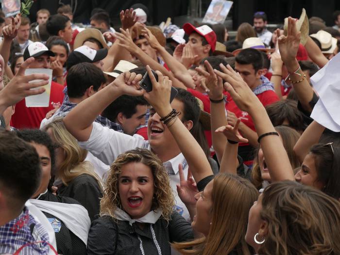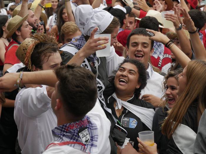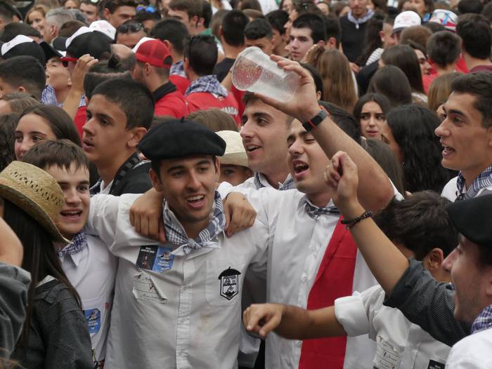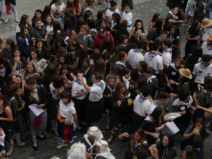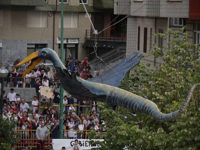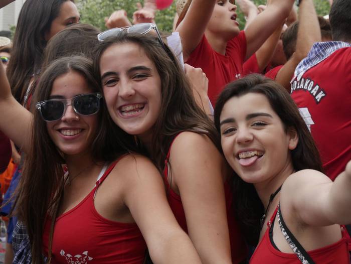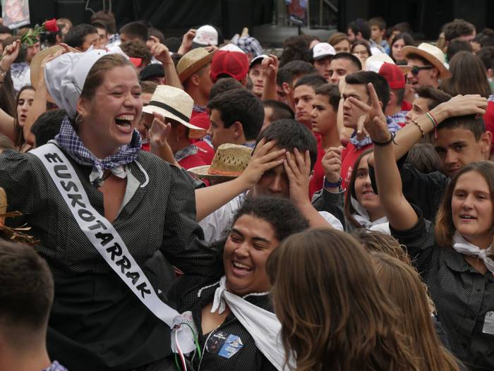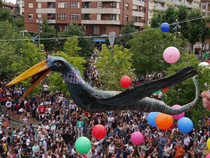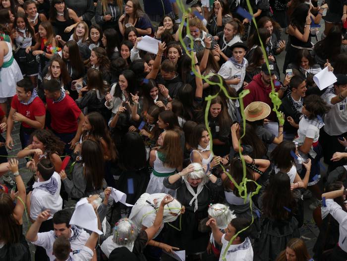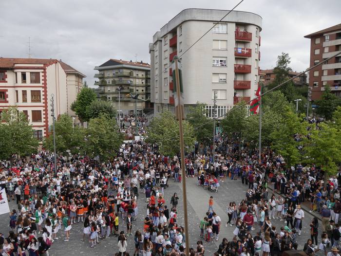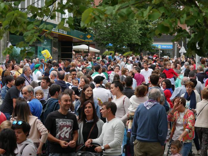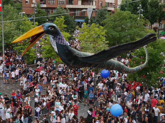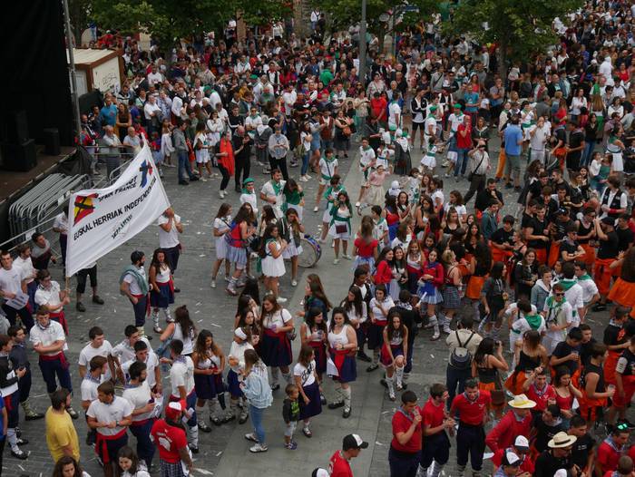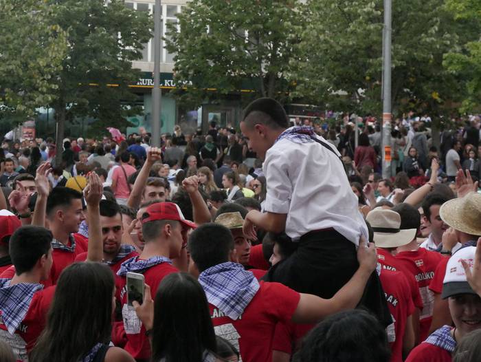 Jende andana batu da nola udaletxe barruan hala kanpoan jaietako txupinazoa ikusteko. Aurtengo pregoia Aiara Dantza Taldeak sortu du, 35. urteurrena bete baitute. Hain zuzen, kide guztiei eskerrak eman dizkie elkarteak. "Hasi dadila festa, hasi dadila sei eguneko dantza!" mezuarekin bukatu du Iraia Aspuru ordezkariak hitzartzea. Ugarte Otxote taldeak kantu batekin omendu ditu dantzariak.