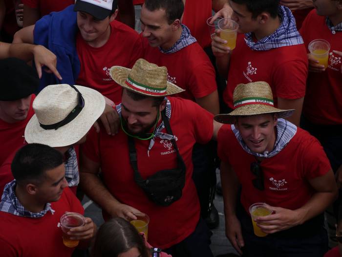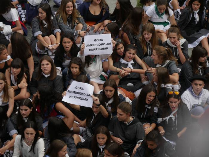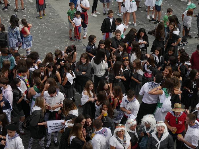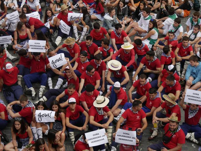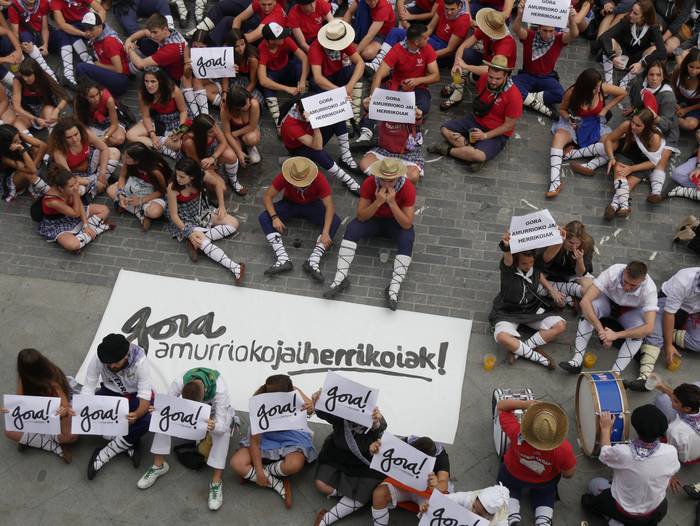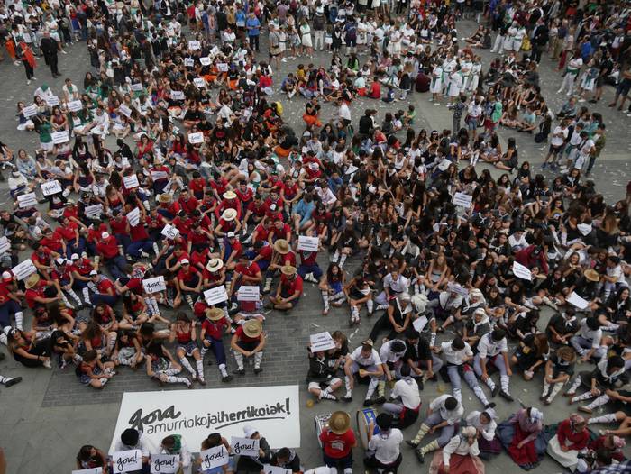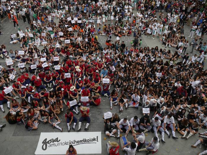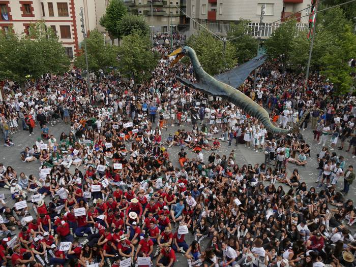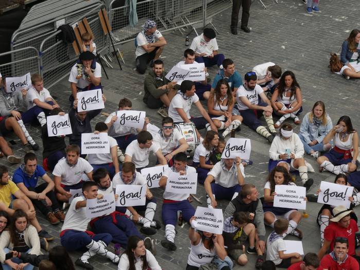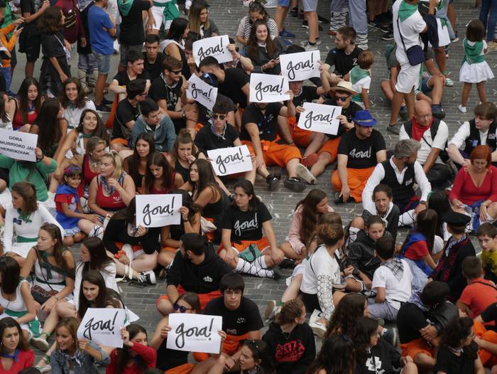 19:00etan ekin diote Iguarrakoa udaletxera hurbiltzeari. Festetako zapia jantzi dio alkateak, eta suziria jaurti dute ondoren. Plazan zeuden jai koadrilek eserialdia egin dute, "Gora jai herrikoiak" afitxak eskutan.