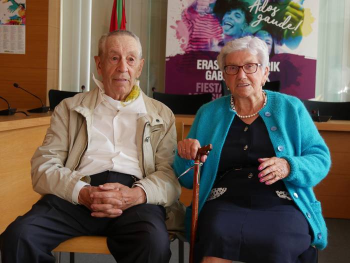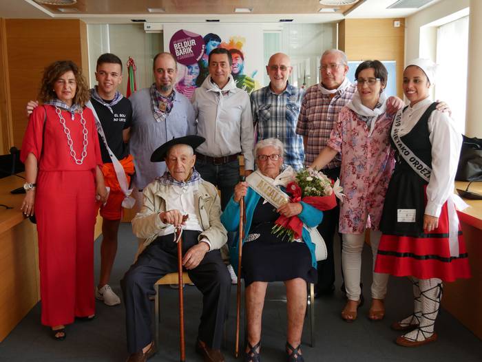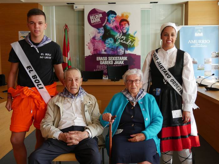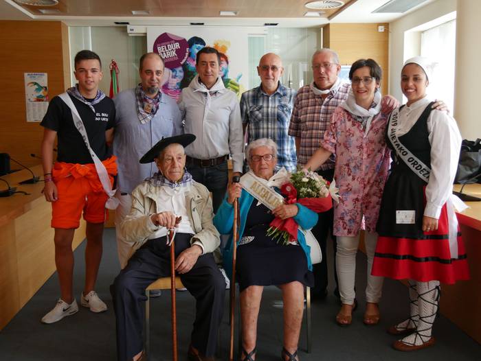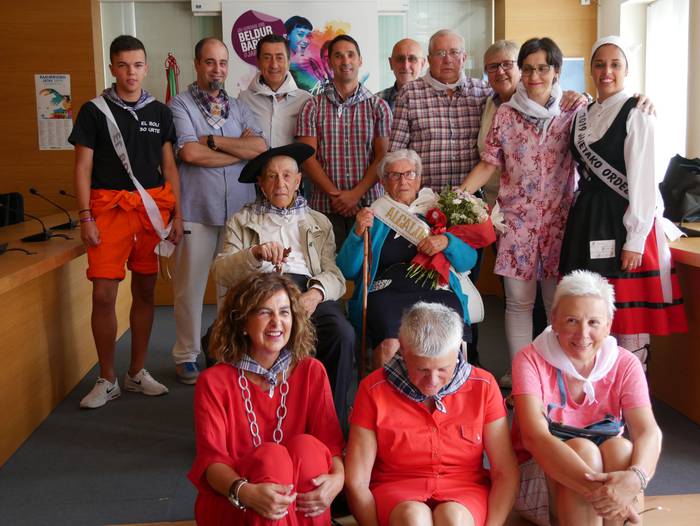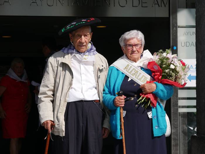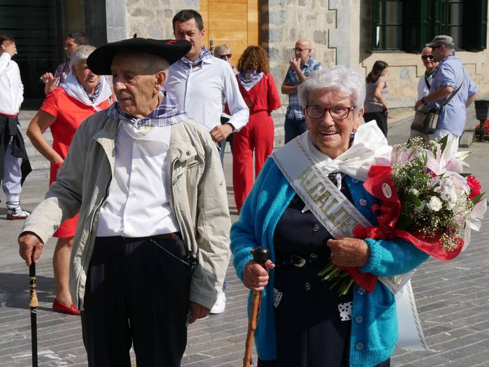 Juanita Zarraga eta Felipe Landaluzek jaso dute "agintearen makila" eta lore sorta, edadetuei eginiko omenaldian. Ondoren, trikitilariekin lagunduta mezara abiatu dira. Nola Zarragak hala Landaluzek pozez jaso dute ekitaldia. Zarragak azaldu duenez, oso garrantzitsua eta berezia da eurentzat gaurko eguna: "zazpietan altxatu naiz garbitu eta dotore-dotore jartzera. Edozein sari baino hobeak dira zuen musuak".
