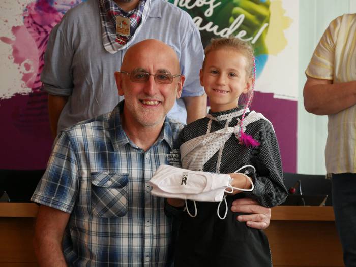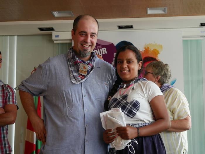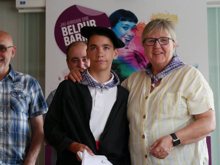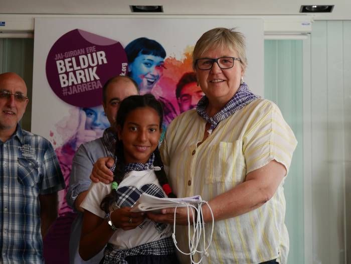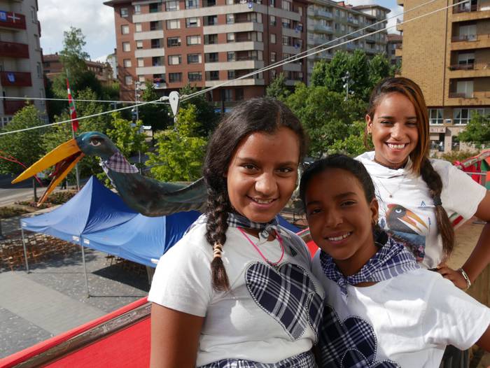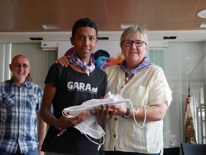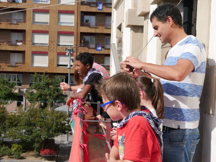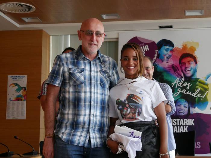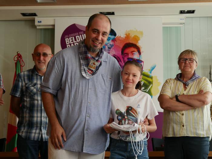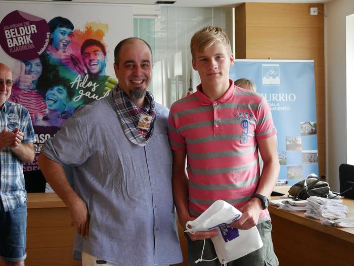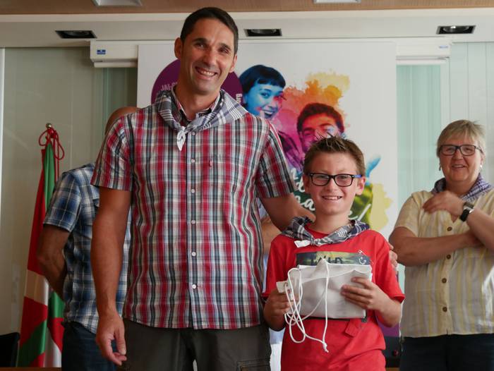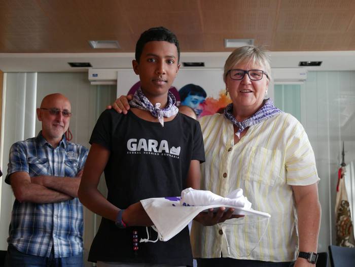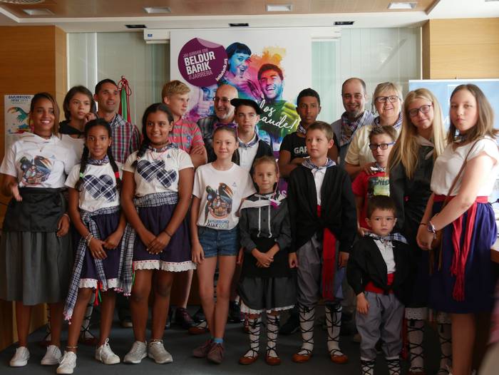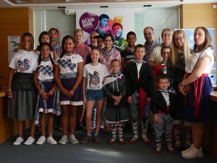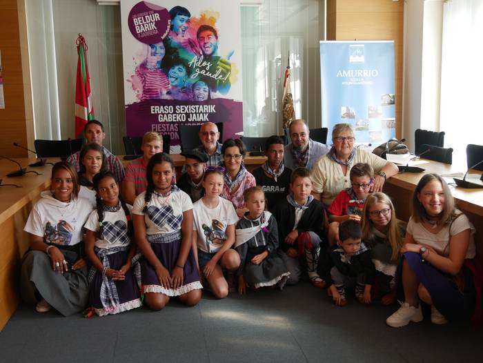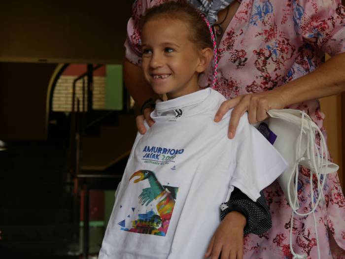 10:30ean izan da lehenbiziko ekitaldia, udaletxean. Udalbatza aretoa elkartasunez bete da, 30 bat lagun bertaratu baitira omenaldira. Batetik, uda Amurrion igaroko duten haurrak; eta, bestetik, bertako harrera familiak. Hala, Josune Irabien alkateak ongietorria eman die; eta kamiseta bana oparitu diete oroigarri gisa. Iguarrakoa ikustera balkoira atera ostean, edadetuen txanda iritsi da.