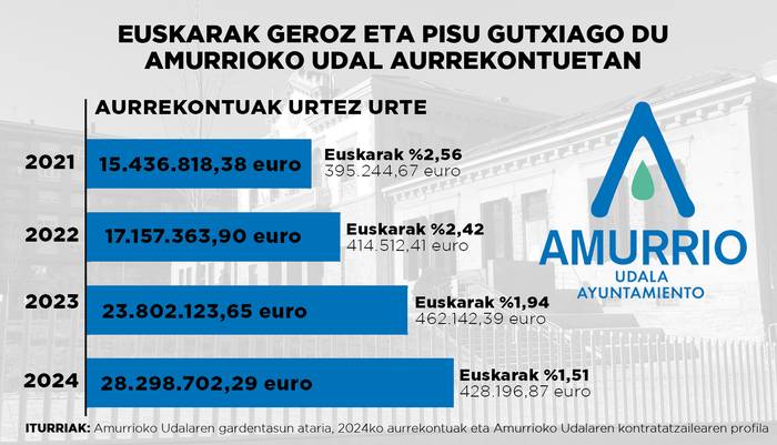 Horrek esan nahi du, langile gastuak kenduta, Amurrioko Udalak bere aurrekontu osoaren %1,20a baino ez duela bideratzen hizkuntzaren biziberritzera (341.930 €).