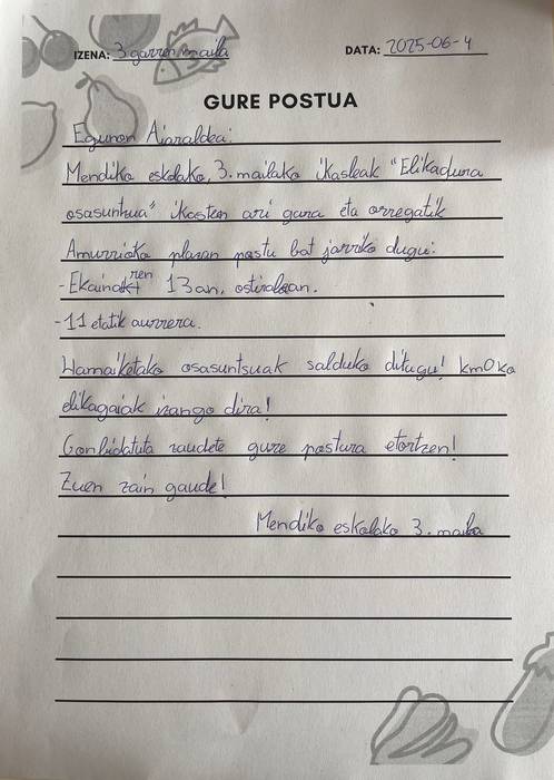 Ikasleak elikadura osasuntsua jorratzen ari dira klasean, eta ikasitakoa praktikara eramateko jarriko dute postua. Zehaztu dutenez, "0 kilometroko elikagaiak" salduko dituzte bertan, eta herritar guztiei luzatu diete bertaratzeko gonbita.