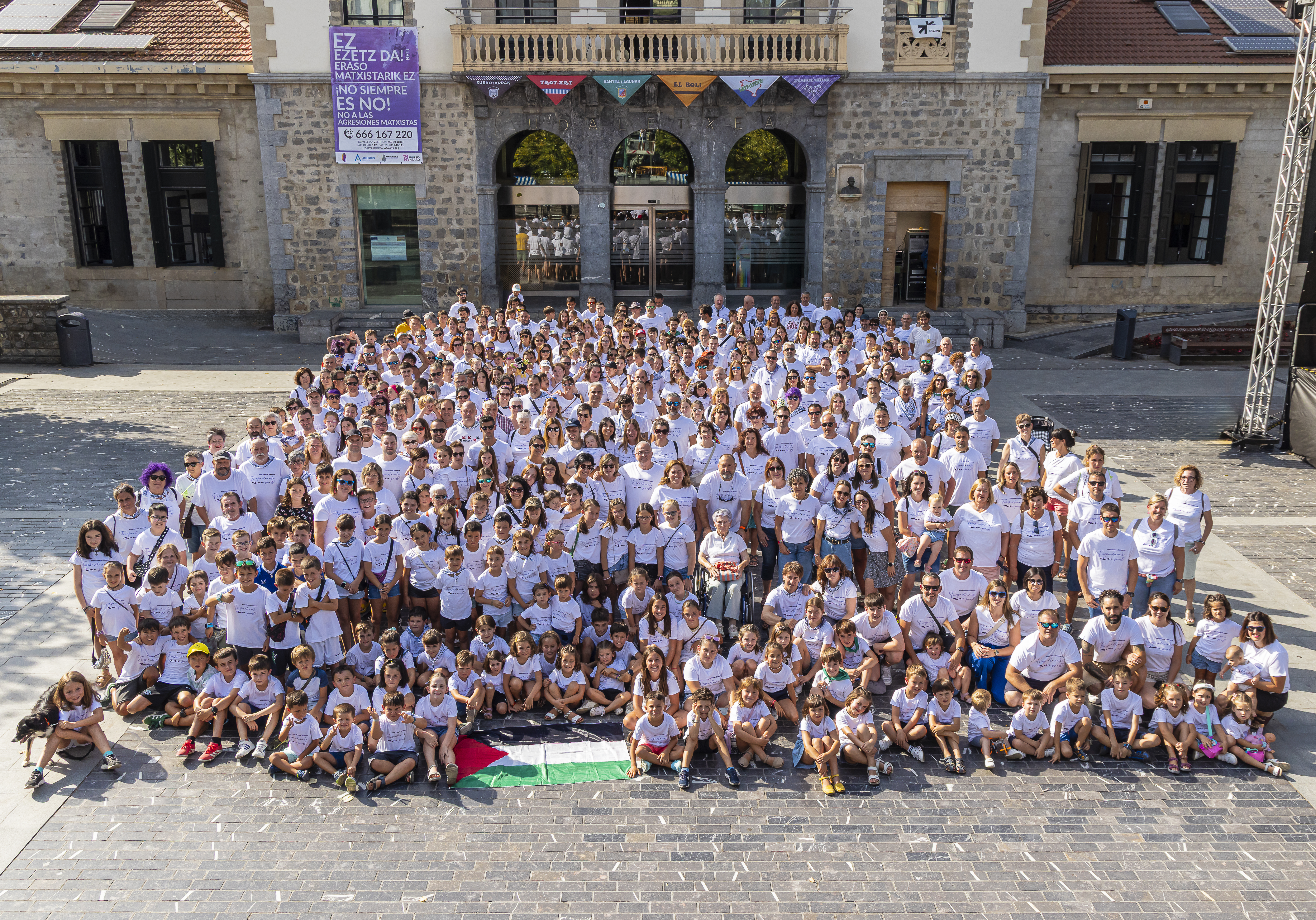 Atzo familia argazki erraldoia egin zuten Ikastolako ikasle, irakasle, guraso eta langileek. Irailean aurkeztuko dute Arba Euskaraz jaiko iruditegi eta lelo ofiziala, baina aurretiaz "txinparta piztu" nahi izan dute herrian uda sasoirako espresuki atera duten kamiseta zurien olatuarekin.