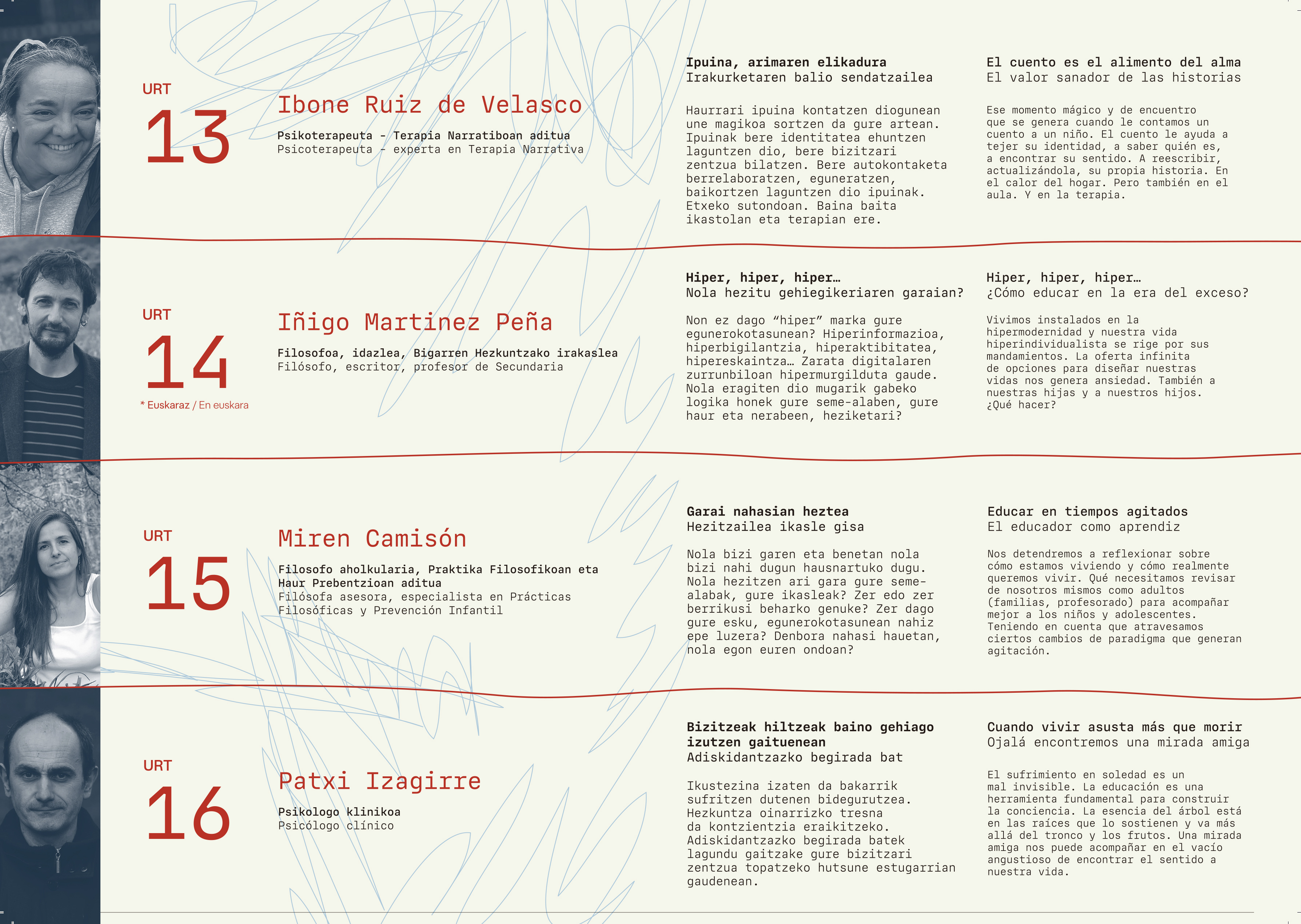 Ibone Ruiz de Velasco psikoterapeuta eta terapia narratiboan adituak emango die jardunaldiei hasiera, eta irakurketaren balio sendatzaileaz arituko da. Filosofoa, idazlea eta Bigarren Hezkuntzako irakaslea da Iñigo Martinez Peña, eta zarata digitalak, hiperinformazioak eta hiperaktibitateak haurren heziketan duen eraginaz hitz egingo du asteazkenean. Lau hitzaldietatik, Martinez Peñarena da euskaraz izango den bakarra.