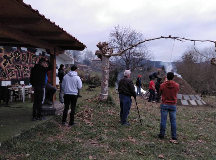 Horretarako txandak egiten ari dira. Izan ere, hainbat egunez egon behar da egurra ura galtzen beroaren ondorioz eta etengabe ziurtatu beharra dago txondorrak zulorik ez duela. Oxigenoa barrura sartuz gero, sua piztuko litzateke eta ezinezkoa izango litzateke egurra ikatza bilakatzea.