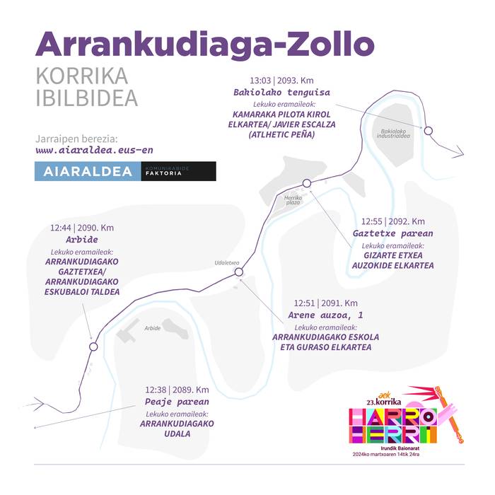 Arrankudiaga-Zollo izango da aurtengo Korrikari agur esango dion udalerria Aiaraldean. Bost kilometroko ibilbidea izango dute bi urtean behin igarotzen den egitasmoaz gozatzeko. Udaleko langileek, Gaztetxeko kideek, Eskubaloi Taldekoek, eskolako langile eta gurasoek, Gizarte Etxeko kideek, Kamaraka Pilota Elkarteak eta Javier Escalza Athletic Peñako zaleek hartuko dute lekukoa udalerrian bertan. Horrez gain, Indarra Futbol Taldeak, Zolloko bizilagunek eta Matxinkorta Mendi Taldeak Ugao eta Zeberio inguruan ere izango dute lekukoari eusteko aukera.