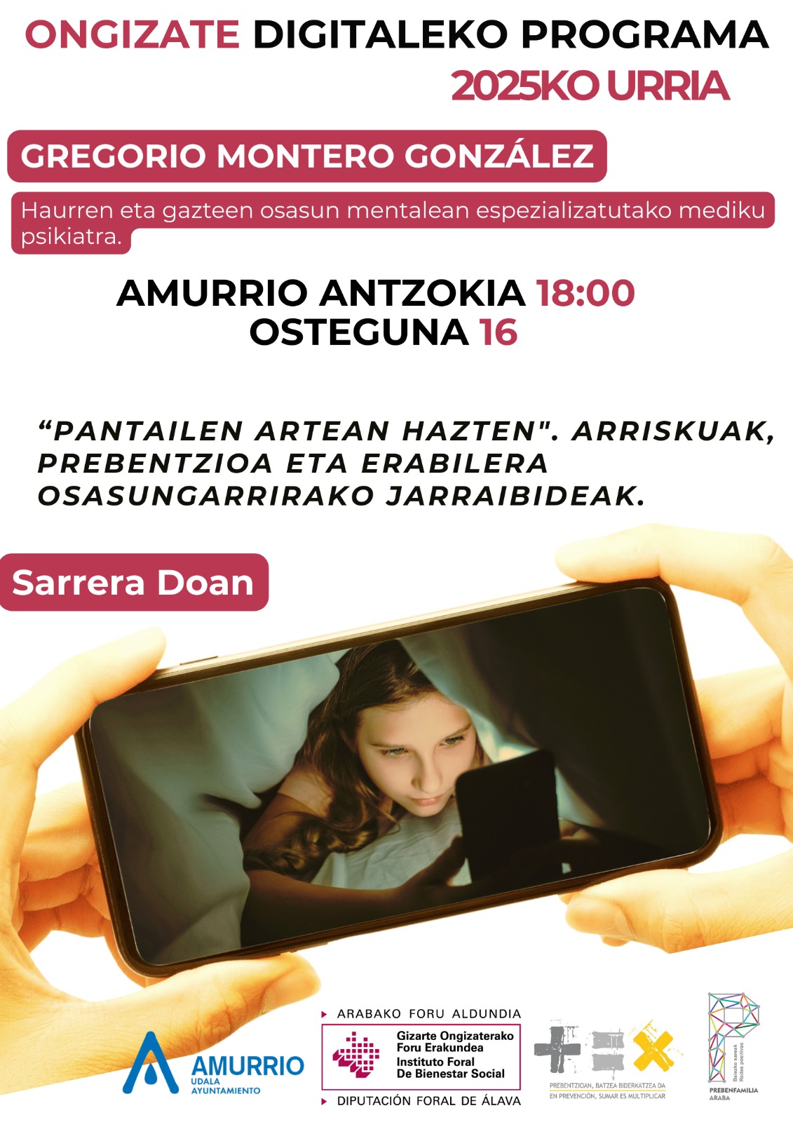 Amurrioko Udalak, Gizarte Ekintza eta Osasun Sailaren bitartez eta Arabako Foru Aldundiarekin elkarlanean, “Pantailen artean hazten. Arriskuak, prebentzioa eta erabilera osasungarrirako jarraibideak” izeneko jardunaldia antolatu du. Saioa datorren urriaren 16an, asteazkenean, 18:00etatik 19:30era egingo da Amurrio Antzokian.