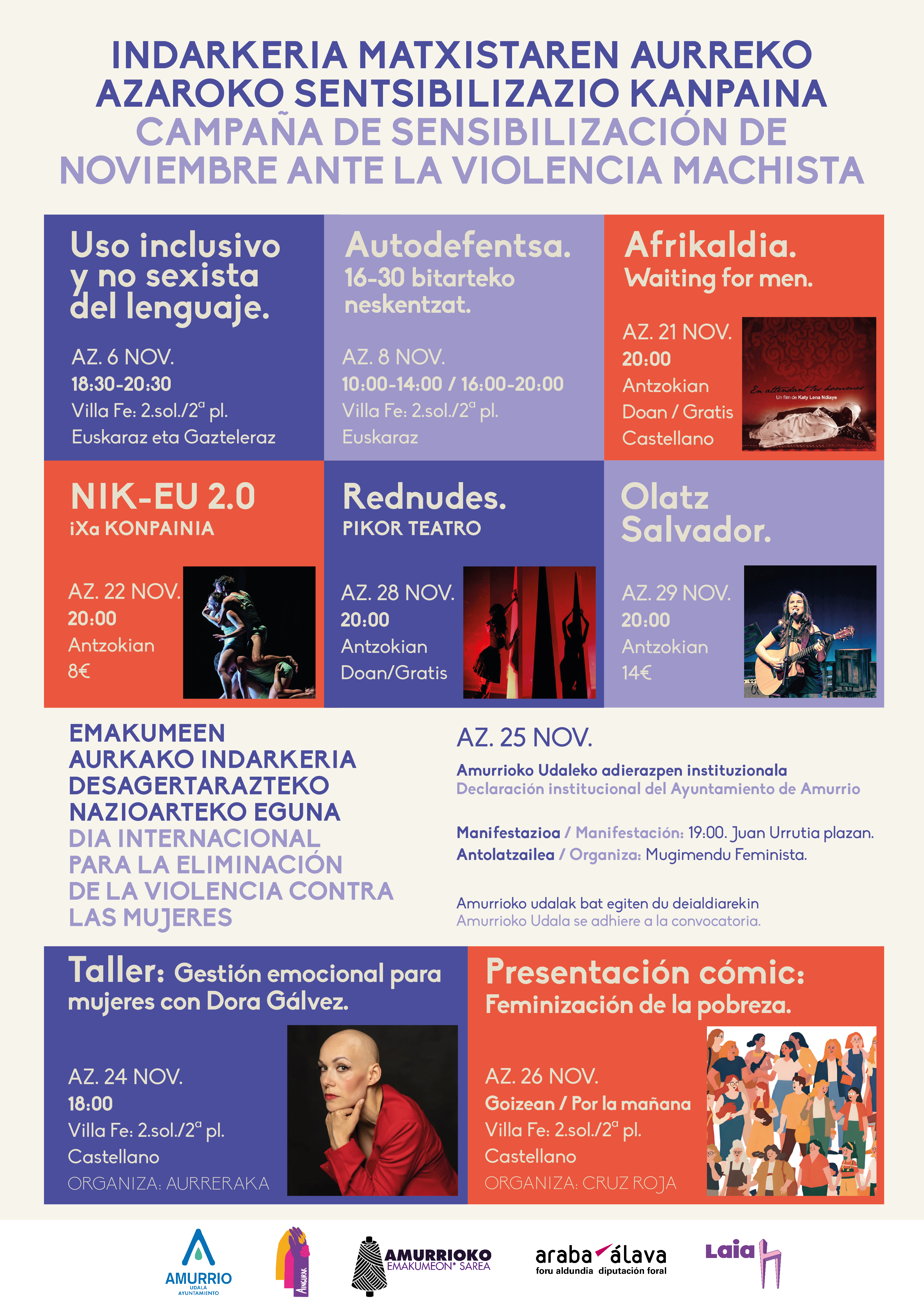 Amurrioko Udalak, herriko elkarte ugarirekin elkarlanean, beste behin ere ekimen ugari biltzen dituen egitaraua jarri du martxan, azaroaren 25aren harira —Emakumeen Aurkako Indarkeriaren Ezabatzeko Nazioarteko Eguna—, sentsibilizazioa, hausnarketa eta indarkeria matxisten aurkako ekintza kolektiboa sustatzeko helburuarekin.