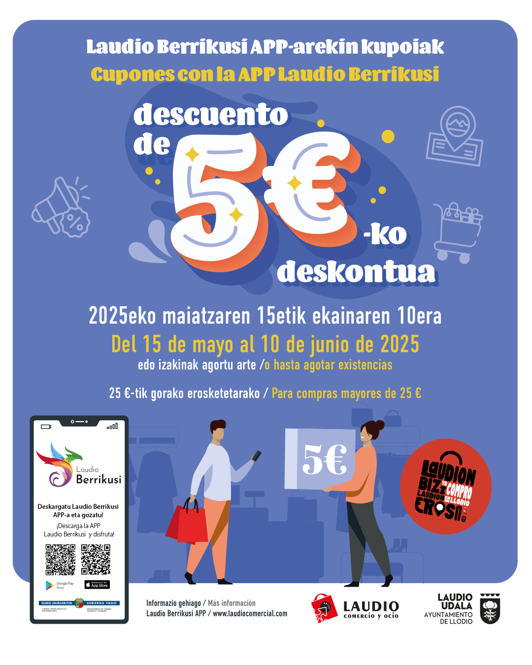 Laudio Berrikusi APP-aren bidez zure deskontu-kupoia lor dezakezu, inskribatutako saltokietan egindako erosketetarako maiatzaren 15etik ekainaren 10era edo izakinak amaitu arte.