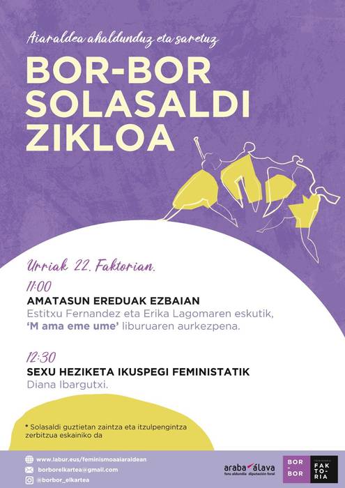 Bor-bor Aiaraldeko Feminismo Elkarteak antolatuta, solasaldi zikloa egingo da udazkenean zehar Aiaraldean. Urriaren 12an ekin zioten ekintzen segidari, Aiaraldeko Mugimendu Feministaren historiari buruzko argazki erakusketa eta tribial aurkezpenarekin. Bigarren ekitaldia larunbat honetan izango da, Aiaraldea Ekintzen Faktorian (Gardeako industriagunean, Errotari 4-8 pabilioia).