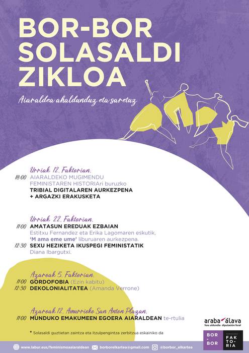 Aurrera doaz Bor-bor Aiaraldeko Feminismo elkarteak antolatutako Bor-bor Solasaldi zikloak. Urriaren 12an eta 22an izan ziren lehenbiziko saioak, eta azaroaren 5ean izango da hurrengo hitzordua. Hain zuzen, deseraiki beharreko beste bi gai edo eremu jorratuko dituzte solasaldi eta tailer formatuan datorren larunbatean. Batetik, gordofobiaz arituko dira Ezin Kabituko kideak. Besteak beste, urrian topaketak egin zituzten Gernikan, problematika ikusgarritu, ahaldundu eta saretzeko helburuarekin. Bestetik, Amanda Verronek dekolonialiatatea izango du ardatz goizeko bigarren txandan.