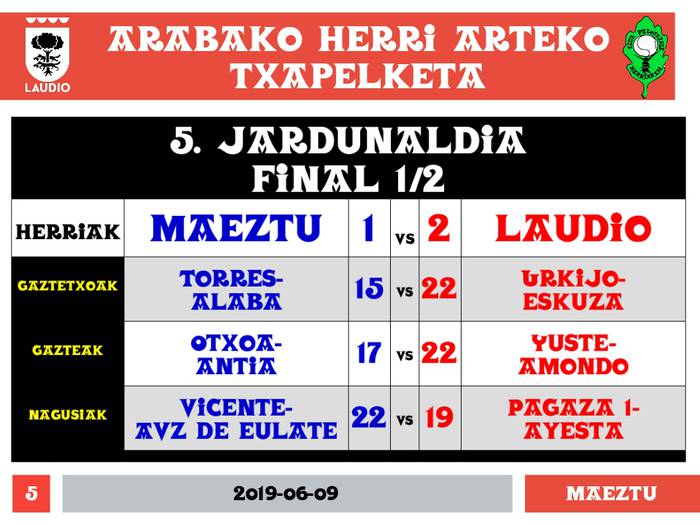 Beraz, taldea prest dugu datorren ekainaren 16an, Araba Euskaraz jaiaren barnean, jokatuko den finalerako. Finalean egotea beti da pozgarria, baina aurten koxka bat gora egin nahi izango genuke eta Laudiok inoiz irabazi ez duen txapela herrira ekartzea litzateke gure asmoa, jakinda ere ez dela erraza izango aurrez aurre talde indartsua izango dugulako, Guardia.