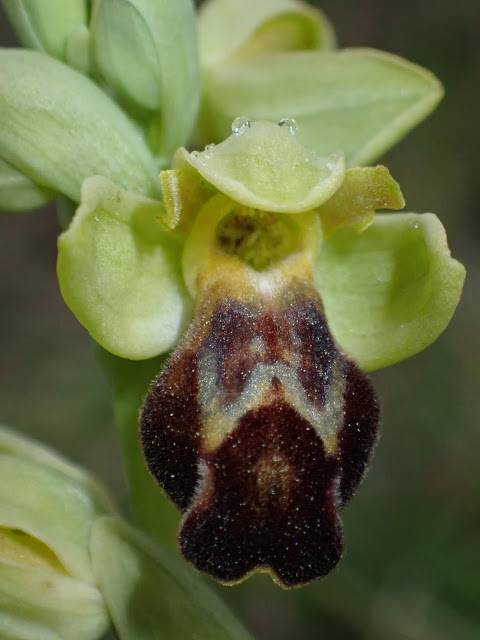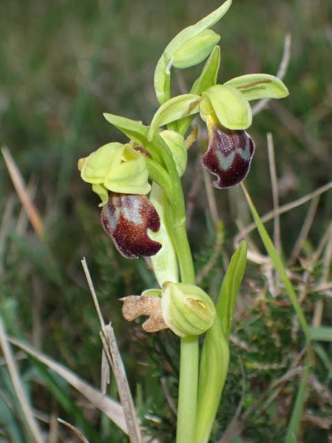 Hormigoizko pistara bueltatu eta ezkerretara joz, nik “Arrañoko loretokia” deitzen dudan gunera heldu gara. Orkidea ugariko bizilekua izaten da leku hau udaberriero, hektarea eskaseko eremuan hamar orkidea espezie batera ikusteko parada izango dugu eta. Baina momentuz goiz da espezie horientzat eta soilik Ophrys sphegodes-en ale herabe eta nimiño batzuk agertu zaizkigu.