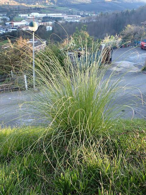 Bidegurutzera helduta, hau da, errepide lauak, behe aldetik datorrenak, azken etxeetara doanak eta Arraño mendira igotzen de hormigoizko pista aldapatsuak bat egiten duten lekura, “kontrolatu” beharreko espeziearen hiru ale ikusi ditugu: panpa-belarra (Cortaderia selloana). Arrañoko bakarrenetakoak dira baina espezie inbaditzailea izanik kontrolpean edukitzea inposatzen da.