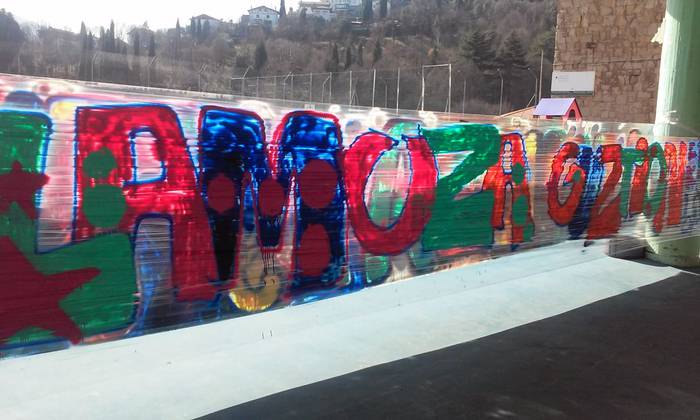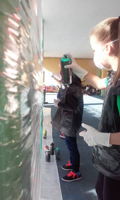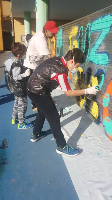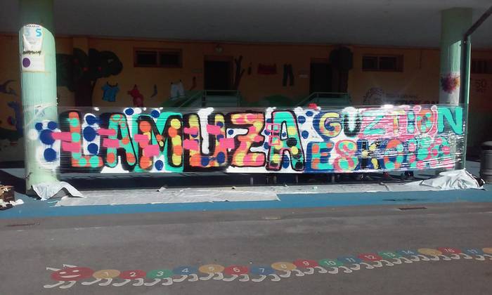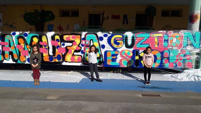 Laudioko Lamuza Ikastetxeak hainbat ekintza antolatu du 50. urteurrenaren harira. Atzo graffiti tailerra eskaini zuten eta sprayekin trebatu ziren umeak.