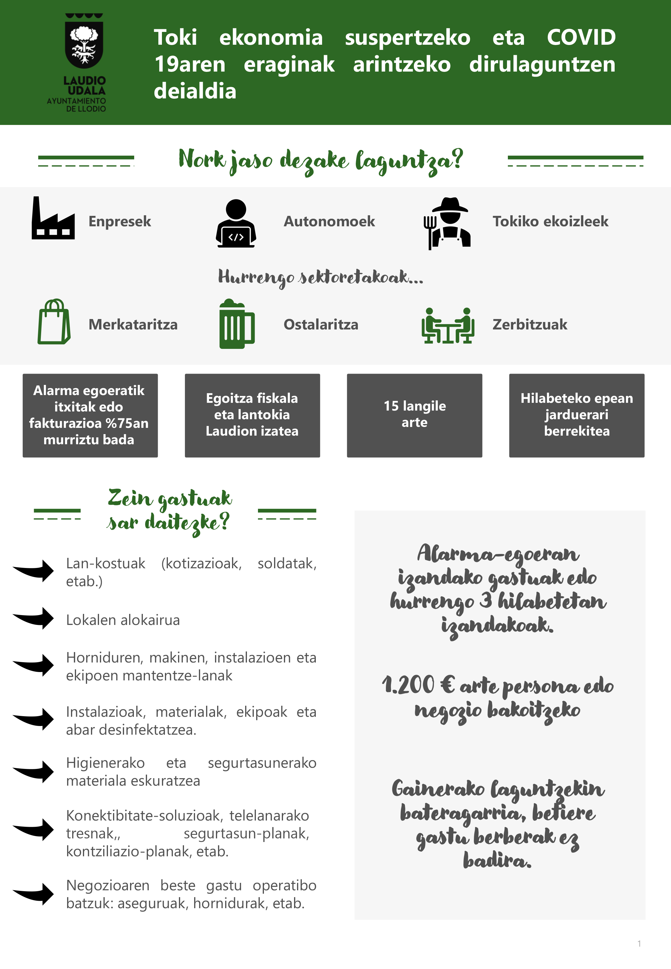 Aste batzuk dira Laudioko Udalak laguntza sorta bat iragarri zuela, COVID-19ren pandemiak eragindako krisi sanitarioaren ondorioak arintzeko. Gaurtik aurrera ofizialki eska daitezke, Arabako Lurralde Historikoaren Aldizkari Ofizialean (ALHAO) argitaratzen den bezala.