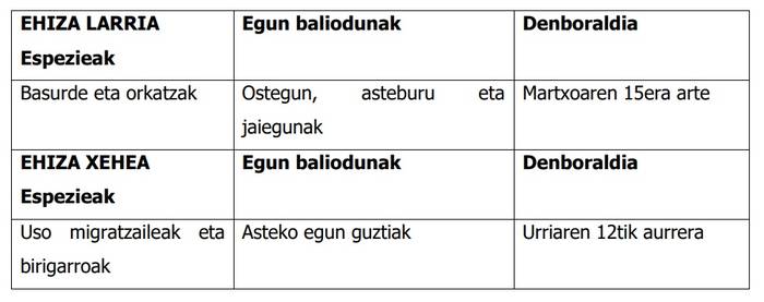 Nolanahi ere, ostegun, asteburu eta jaiegunetan baino ezingo da ehizatu. Ehiza xehearen sasoia, ostera, urriaren 12an hasi da. Horiek horrela, uso migratzaileak eta birigarroak ehizatu ahalko dira Laudion baimendutako postuetan, urtarrila amaitu arte. Ehiza xehearen kasuan, asteko egun guztietan ehizatu ahalko da.