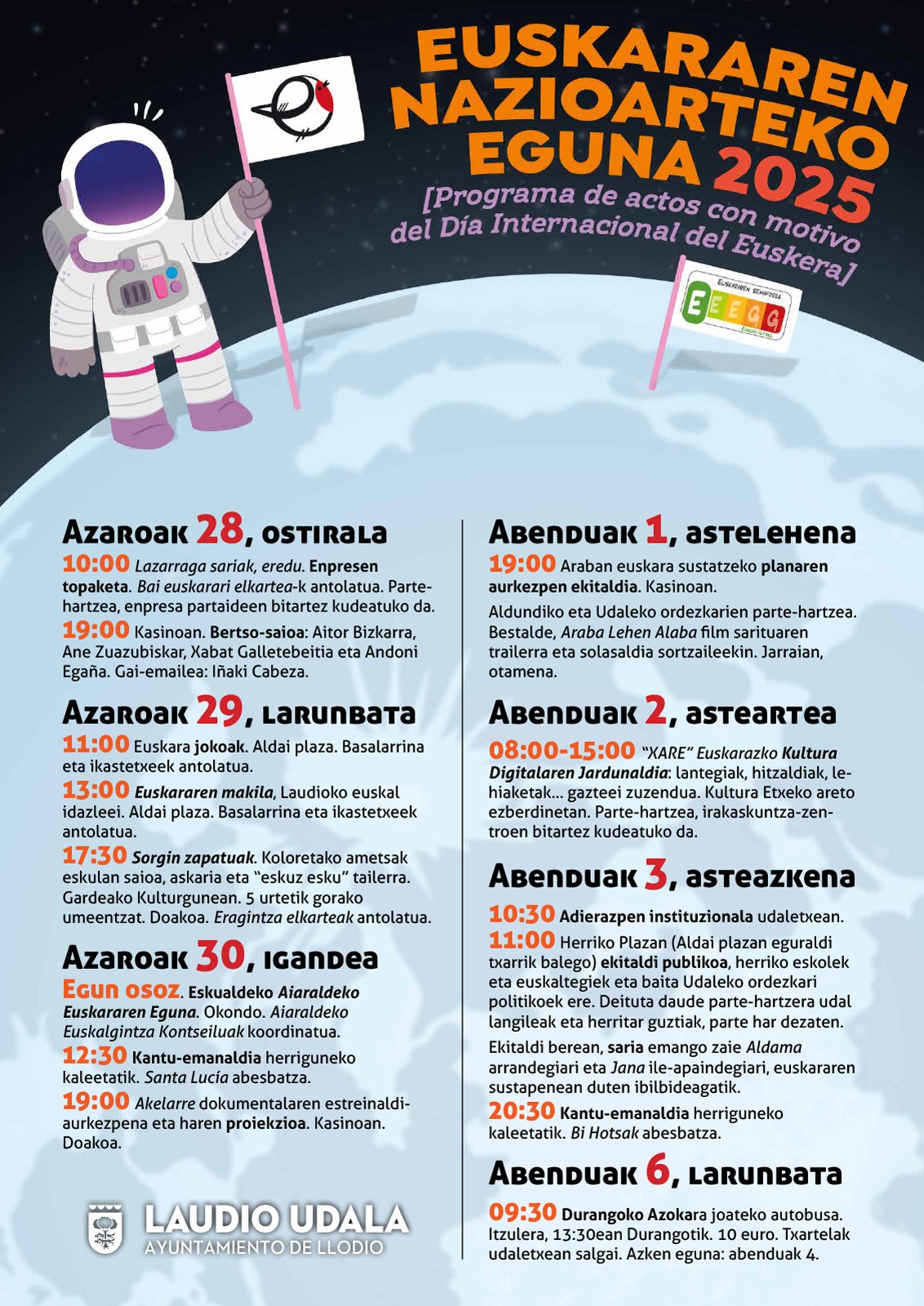 Beste urte batez Laudioko Udalak, Hizkuntza Normalizaziorako Zerbitzu-unitatearen bitartez, eta udalerriko elkarte eta ikastetxeekin batera, abenduaren 3an ospatzen den Euskararen Nazioarteko Egunarekin bat egiteko egitarau zabala prestatu du, euskara herriko toki guztietara eramateko. “Euskararen aldeko konpromisoa urte osoan zehar eraikitzen da: eskolan eta etxean, kalean eta sarean, kultura ekimenetan eta eguneroko hautu txikietan. Euskaraz eginez irabazten dugu denok”, adierazi du Nagore Gomara Hizkuntza Politiketarako zinegotziak.