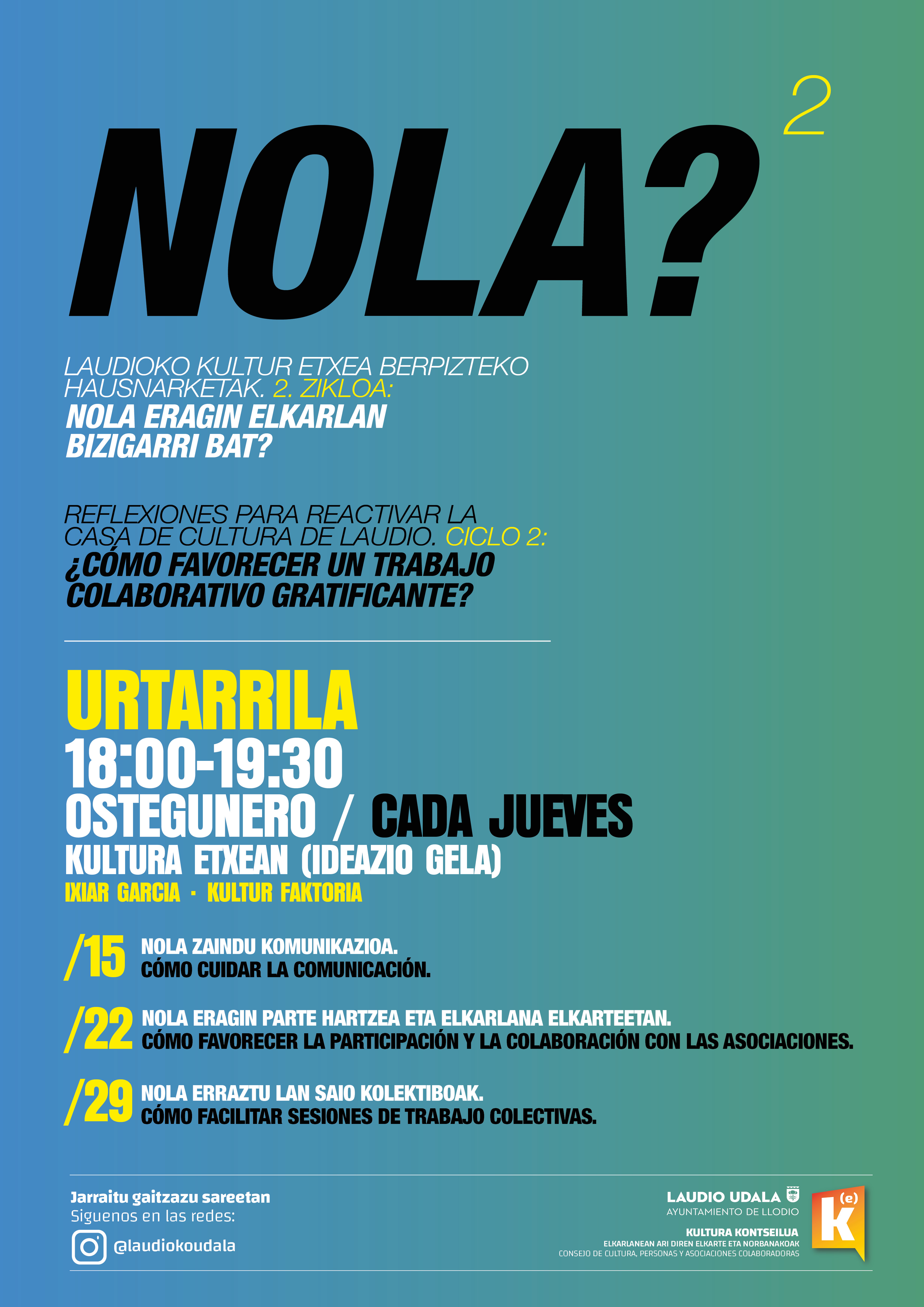 Joan den azaroan Laudioko Kultura Etxeko proiektuaren egungo egoera aurkeztu zen, espazioak etorkizunean izango dituen erabilen lehen pausuak emanez. Gauzak horrela, hil honetan, zehazki 15ean, 22an eta 29an, ekimen parte hartzaileak eta elkarlan giroan garatzeko lagungarriak diren baldintzak identifikatzeko hiru lan saio eskainiko dira. Oraingo honetan, tailerrak Ixiar Garciak, Aiaraldea Ekintzen Faktoriako kultura arduradunak, eskainiko ditu.