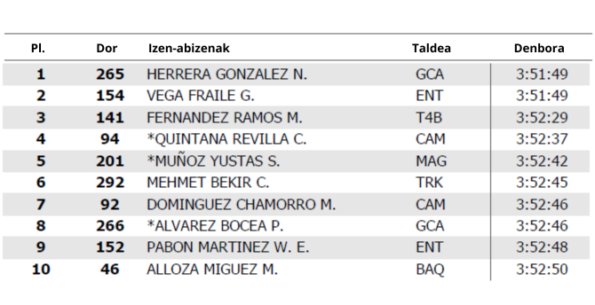 Nestor Herrera laugarren sartu da helmugan. Haren atzetik bi segundoko eten txiki bat gertatu da, ordura arte lasterketako liderra izan denak zeraman aldea, hain zuzen ere. Horrela, denborari dagokionez berdintsu, "puestometroak" markatu du posizioa. Lider aldaketa bat utzi digu egunak, lehen bi postuetako lasterkariak denbora berarekin sailkatuta, lau etapa eta 150 km baino gehiagoko lehiaketaren ondoren.