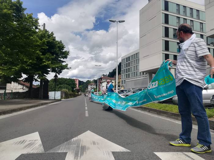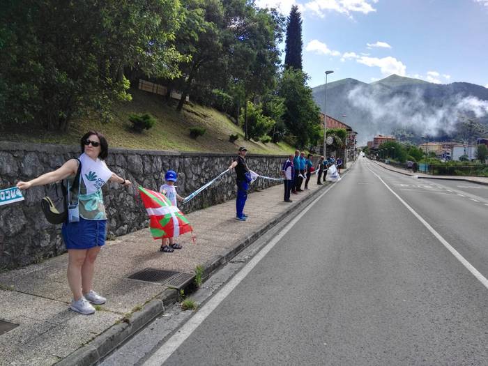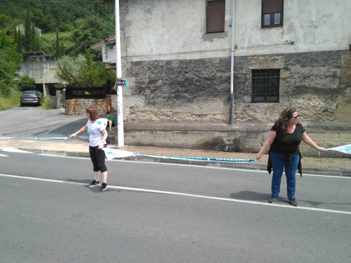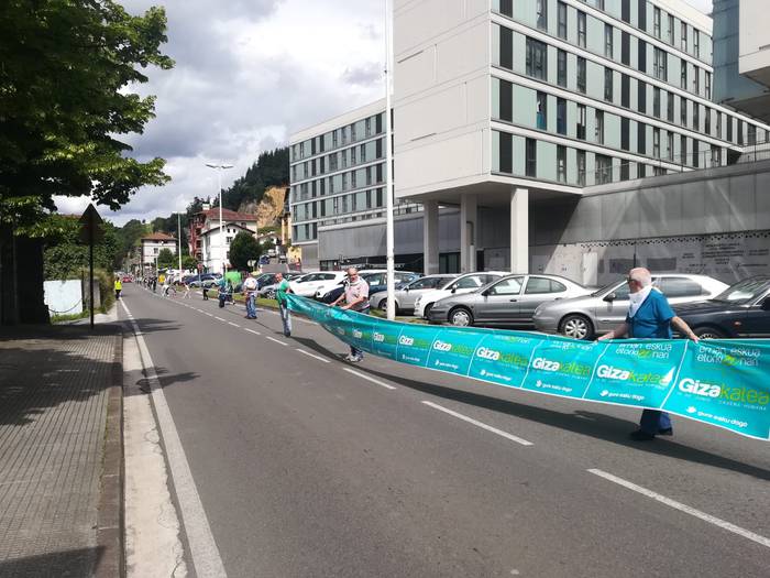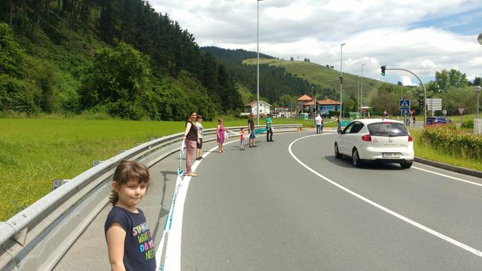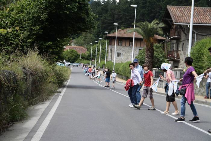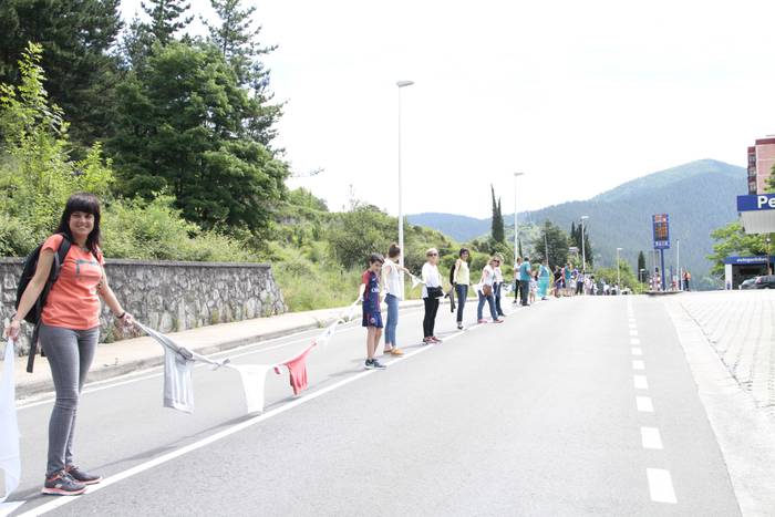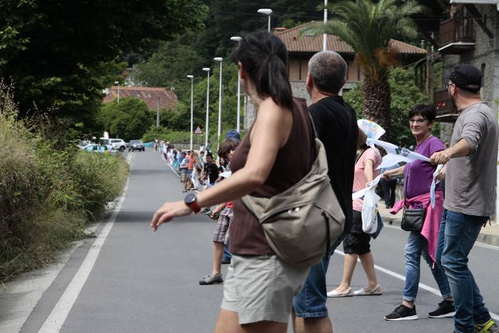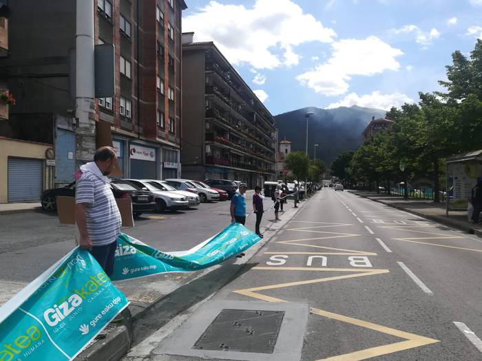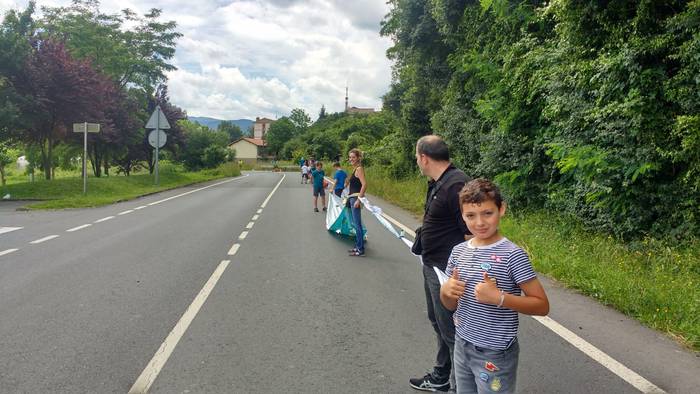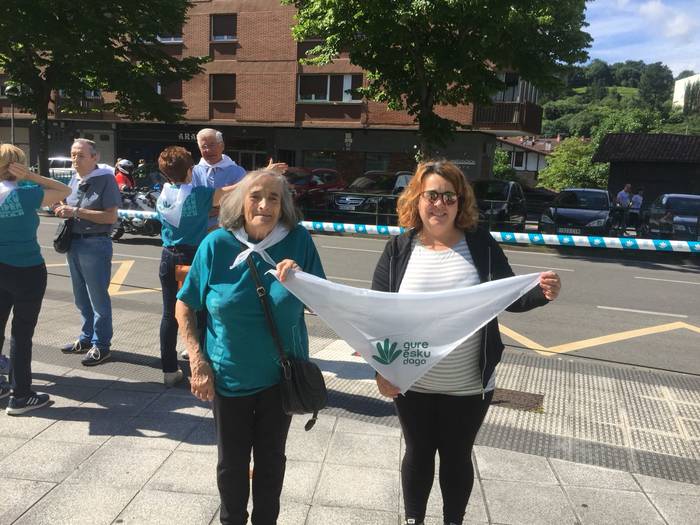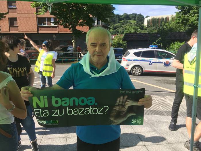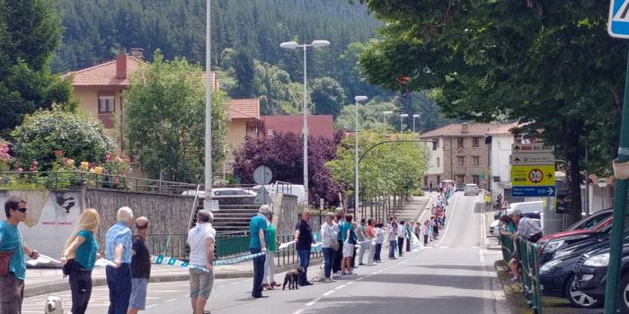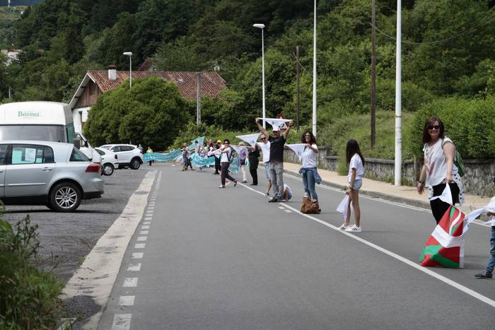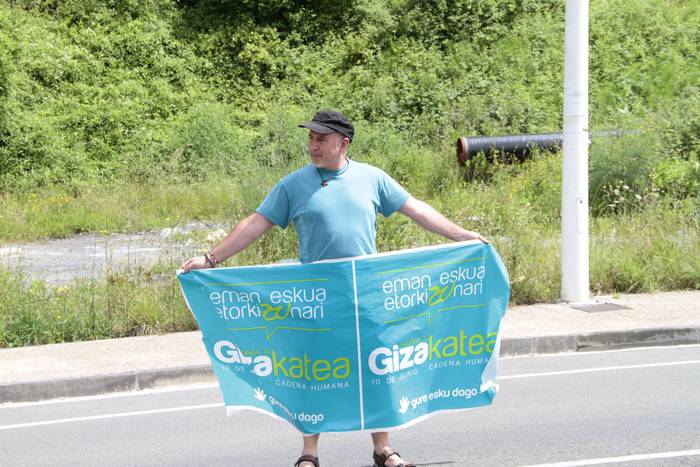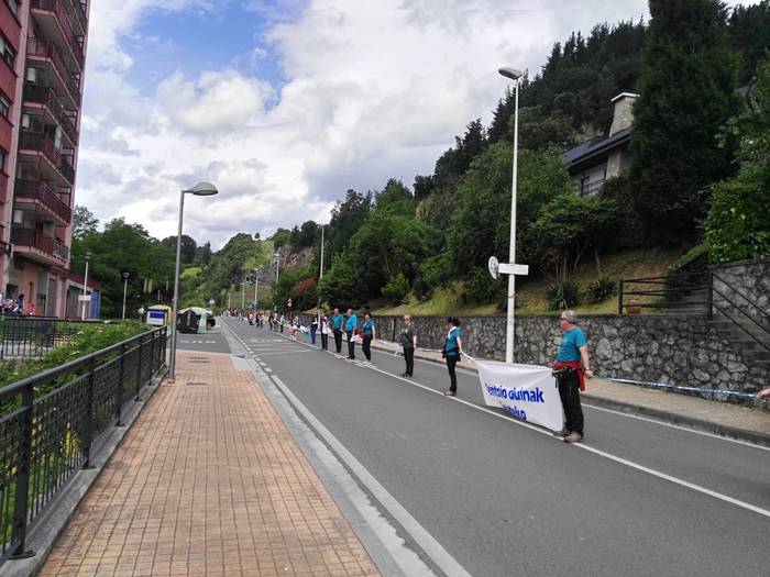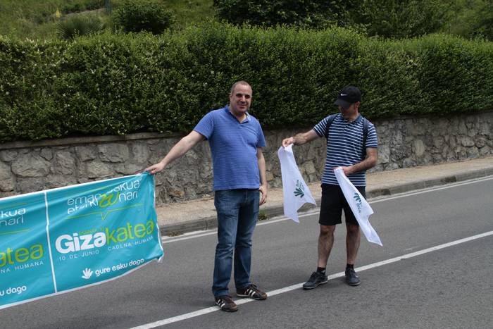 Aretako herritarrek goizean goiz hasi dira kalera ateratzen bere lekua hartzeko Gure Esku Dagok giza katean. Karparen inguruan elkartu dira eta gero errepidean banatzeko.