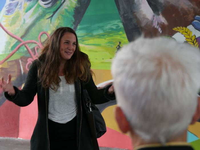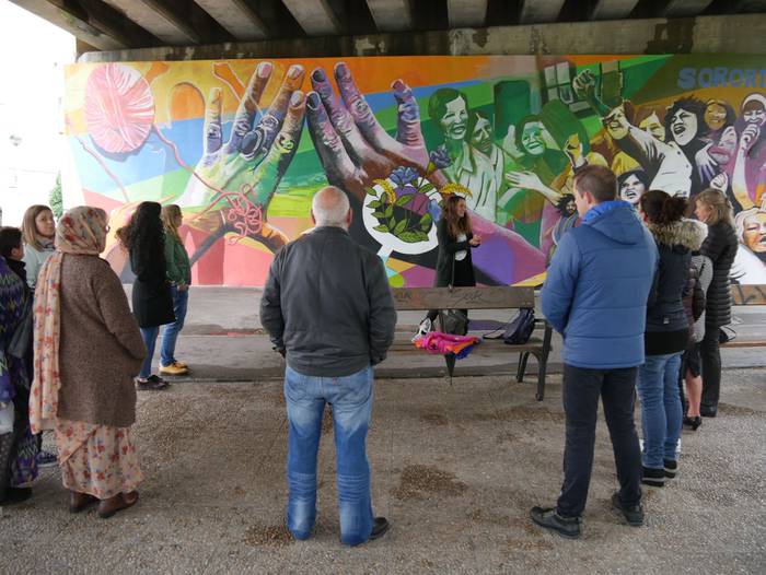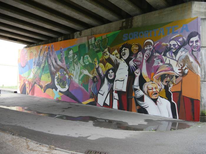 Atzo izan zen muralaren aurkezpen ekitaldia Laudion. "Emakumeen aniztasuna eta elkartasuna islatu ditugu", adierazi dio Aiaraldea hedabideari sortzaileak. Amets Meatza alkateordeak hasi zuen ekitaldia, proiektuaren nondik norakoak gogora ekarriz: "Indarkeria matxista salatu nahi izan dugu". Berdintasun zerbitzuak sustatu du ekintza, horma irudi parte hartzailea. Gogoetarako saioen bidez erabaki dute zer irudikatu paretan, Irantzu Lekuek azaldu duenez: "Sororitatea, sahara, Amagoia Elezkano indarkeria matxistak eraildako herritarra, emakumeen borroka... atera ziren ideia gisa".