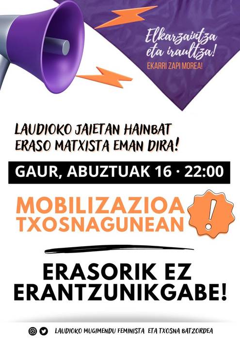 Laudioko Jaietan hainbat eraso matxista jazo direla salatu dute Mugimendu Feministak eta Txosna Batzordeak, eta mobilizazioa deitu dute gertatutakoa salatzeko. Gaur -abuztuak 16- izango da protesta ekimena, Txosnagunean bertan, 22:00etan.