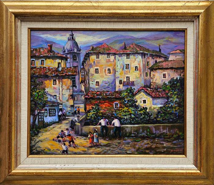 Bai, izango dut. Ez dakit zehatz mehatz, etxean eta biltegian daukadan guztia nahasten aurkitzen baititut koadro hauek. Badaukat garai hartako lanen bat, Laudioko plazako zezenena agian, eta etxe zaharren bat ere bai. Badakit dauzkadala, baina ez dakit non dauden.
