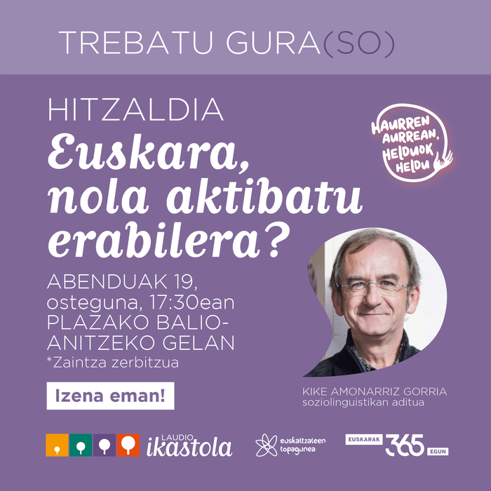 Lehenego hitzaldia Euskara, nola aktibatu erabilera? izango da, Kike Amonarriz Gorriaren eskutik. Kike Euskaltzaleen Topaguneko lehendakari ohia da, baita sozioliguistikan aditua ere.