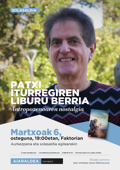Antropozenoaren nostalgia narrazio-liburua argitaratu du Patxi Iturregik, Elkar argitaletxearen eskutik, eta ostegun honetan, hilak 6, aurkeztuko du Faktorian. 19:00tan izango da solasaldia, eta Aiaraldea Komunikabideak zuzenean emitituko du Aiaraldea.eus atarian.