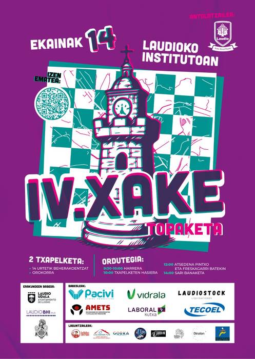 Laudioko IV. Xake Topaketa ospatuko dute ekainaren 14an institutuko jolastokian 09:30etik aurrera. Mikel Meneses antolakuntzako kideak iragarri du 128 jokalari batuko direla parte hartzeko. "Plaza mugatuak ditugu, 64 kategoria bakoitzeko, eta urtero betetzen ditugu".