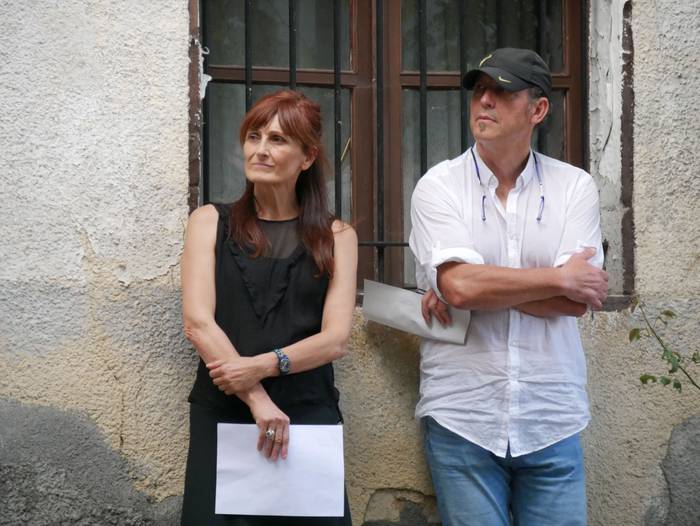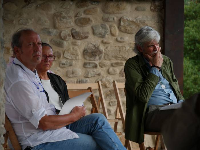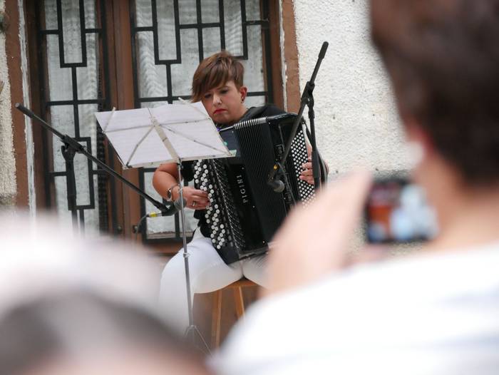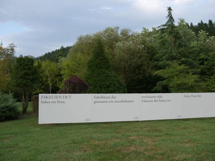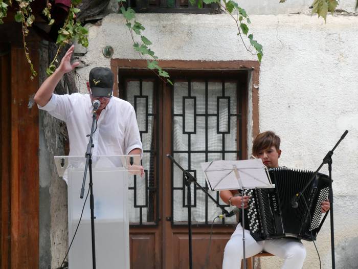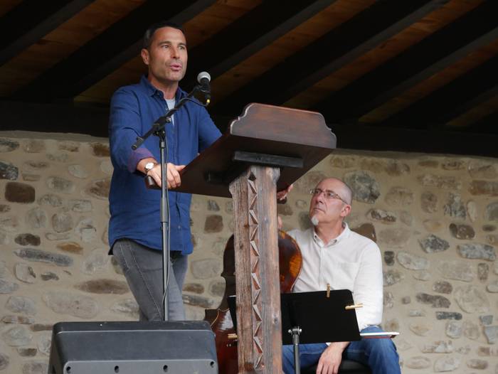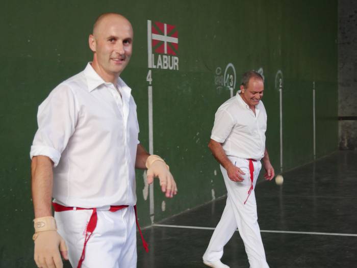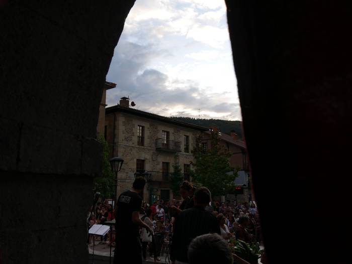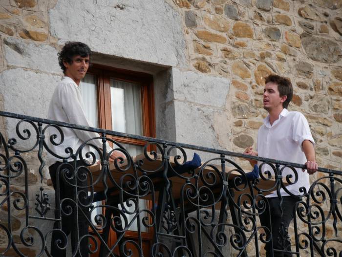 Segidan San Anton iturrira joan ziren, Mirian Roman akordeoi jolearekin batera poemen irakurketarekin jarraitzera. Handik, frontoira jo zuten, “giharrak astintzera zihoan tokira”. Hala, Juantxu Uribarren eta Iker Iriondo aritu ziren pilotan, Orozkoko eskolako umeek Blas de Oteroren testua irakurri bitartean. Guzti hori Josu Amondarain eta Aitzol Basalduaren txalaparta hotsekin aurkeztu zioten herriari. Jarraian, Bertso Eskolako kideen txanda heldu zen.