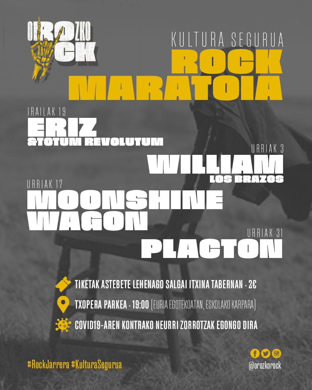 Moonshine Wagon taldeak zuzeneko emanaldia eskainiko du larunbatean 19:00etan Orozkon. Izan ere, zailtasunak zailtasun, Orozkorock jaialdiaren antolatzaileek ez dute amore eman eta zenbait kontzertu prestatu dituzte udazkenean. Eriz & Totumrevolutum eta William los brazos aritu dira herrian jotzen.