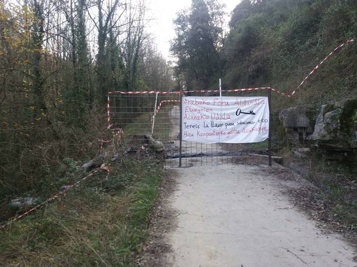 Pankarta bidez salatu dute instituzioen utzikeria: "Momentuz ez dugu auzolan gehiago egiteko asmorik, pankartan aipatzen ditugun instituzioen erantzunaren zain gaude". Hain zuzen, Arabako Foru Aldundia, Etxegoien eta Aiarako Udalari eskatu diete egoera konpontzea. Izan ere, Etxegoien eta Mendeika lotzen ditu bideak, 1.500 metroko tramoa da orotara. "Etxegoieneko lurretan 900 metro konpontzea falta da ibilgailuak igarotzeko aukera egoteko", adierazi dute.